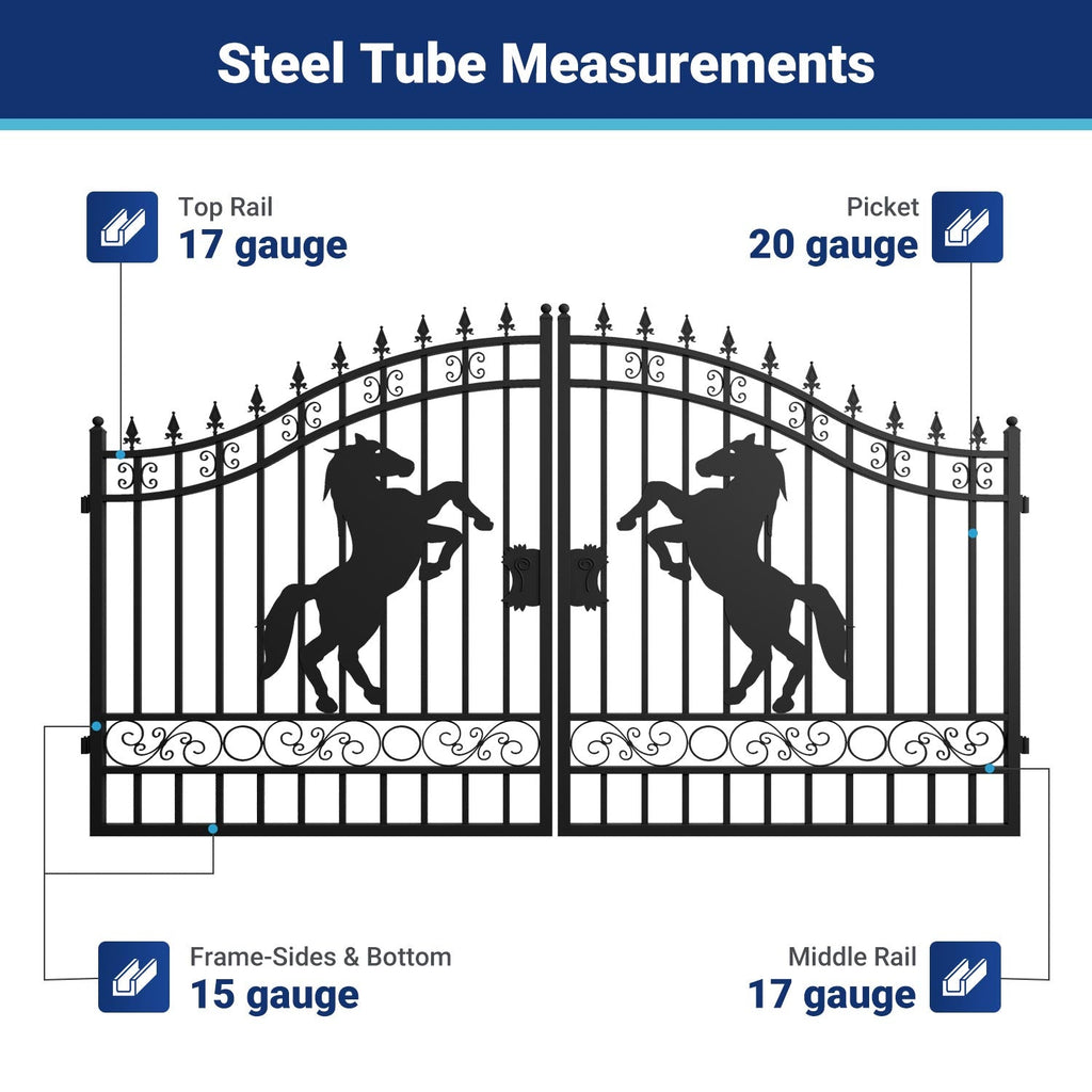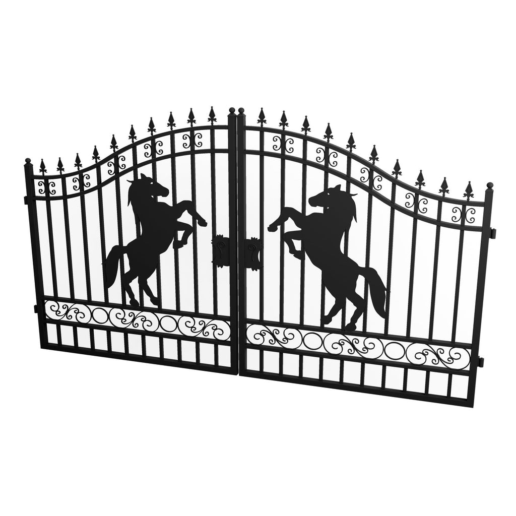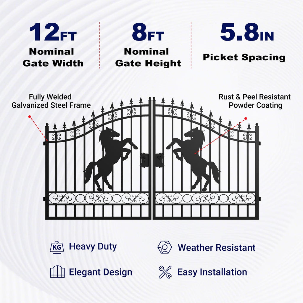 This 12' dual swing wrought iron gate features an exquisite horse pattern, crafted from heavy-duty iron for durability. With dimensions of W11.8xH7.54 ft, it adds a touch of elegance and security to your property. The robust construction ensures long-lasting performance, making it a perfect choice for both residential and commercial use.