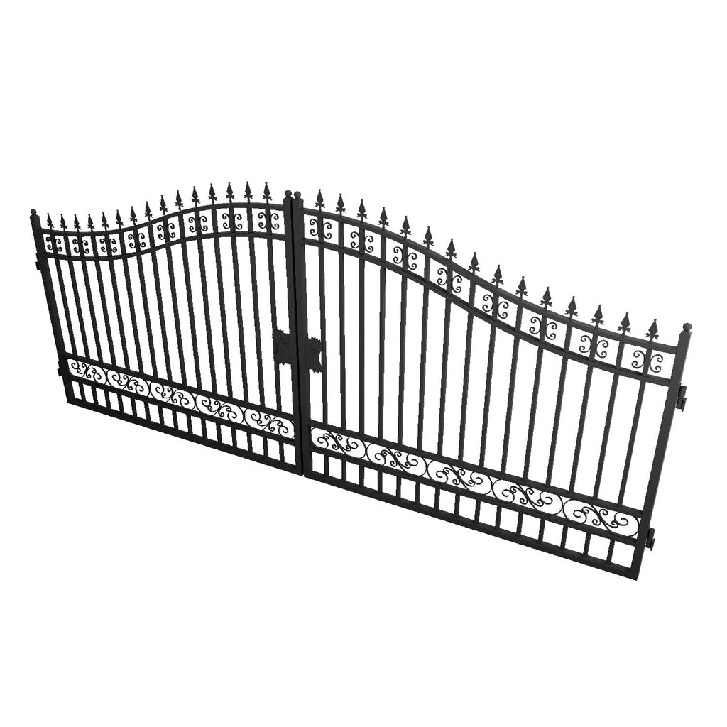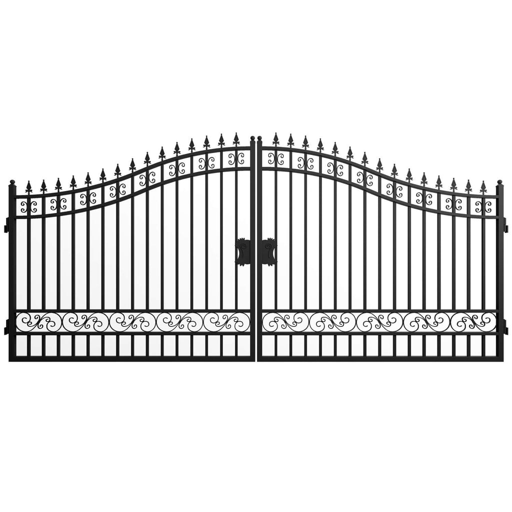 This 16-foot dual swing wrought iron gate offers a classic, timeless look with clean, unadorned lines. Built for durability and security, its sturdy iron construction provides an elegant entryway, while the lack of decorative elements offers a sleek, minimalist aesthetic.