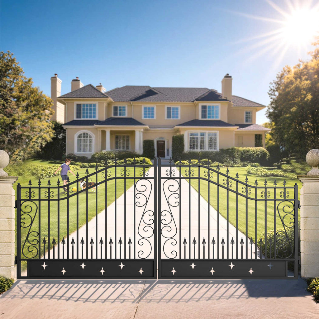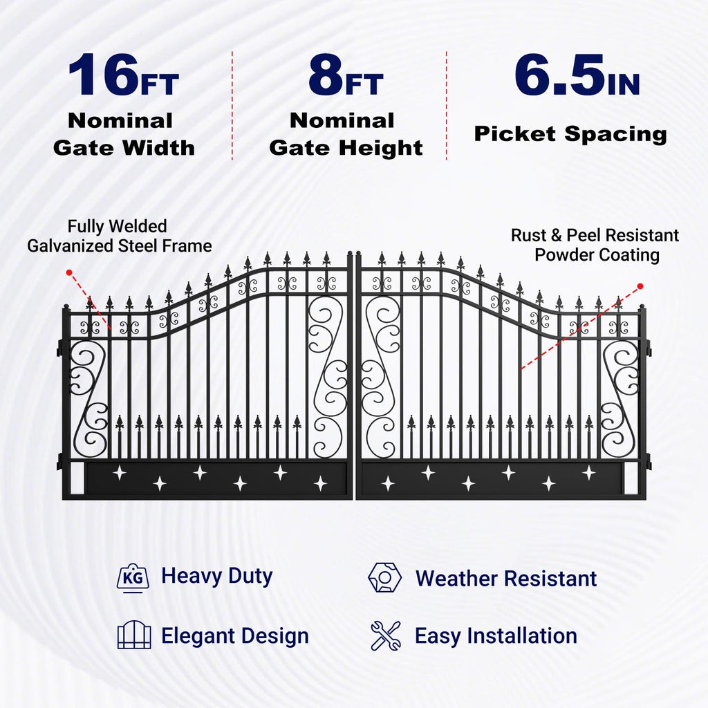 This 16' dual swing wrought iron gate boasts a striking star pattern, crafted from heavy-duty cast iron for exceptional durability. With dimensions of W15.74xH7.54 ft, it offers both grandeur and security. The robust construction ensures longevity, making it a perfect choice to enhance the entrance of any property.
