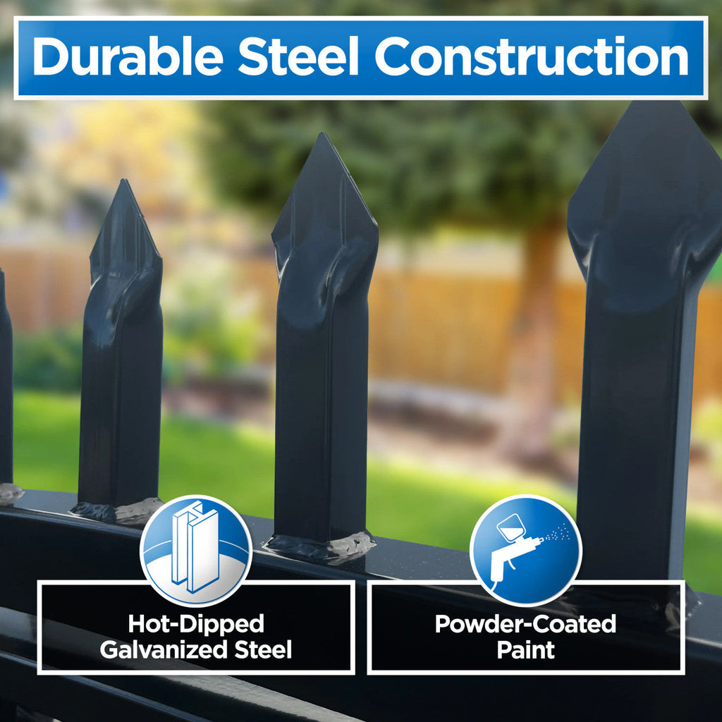This 16'x7' Steel Dual Swing Driveway Gate combines strength and corrosion resistance with hot-dip powder-coated galvanized steel and a built-in pedestrian door for easy access. The gate measures 16 x 7.2 feet, with posts standing 9.4 feet tall and 3.2 inches wide. Its galvanized pipes (3.1 x 3.1 x 0.1 inches) ensure durability, while the pedestrian door is 6.25 x 2.5 feet.