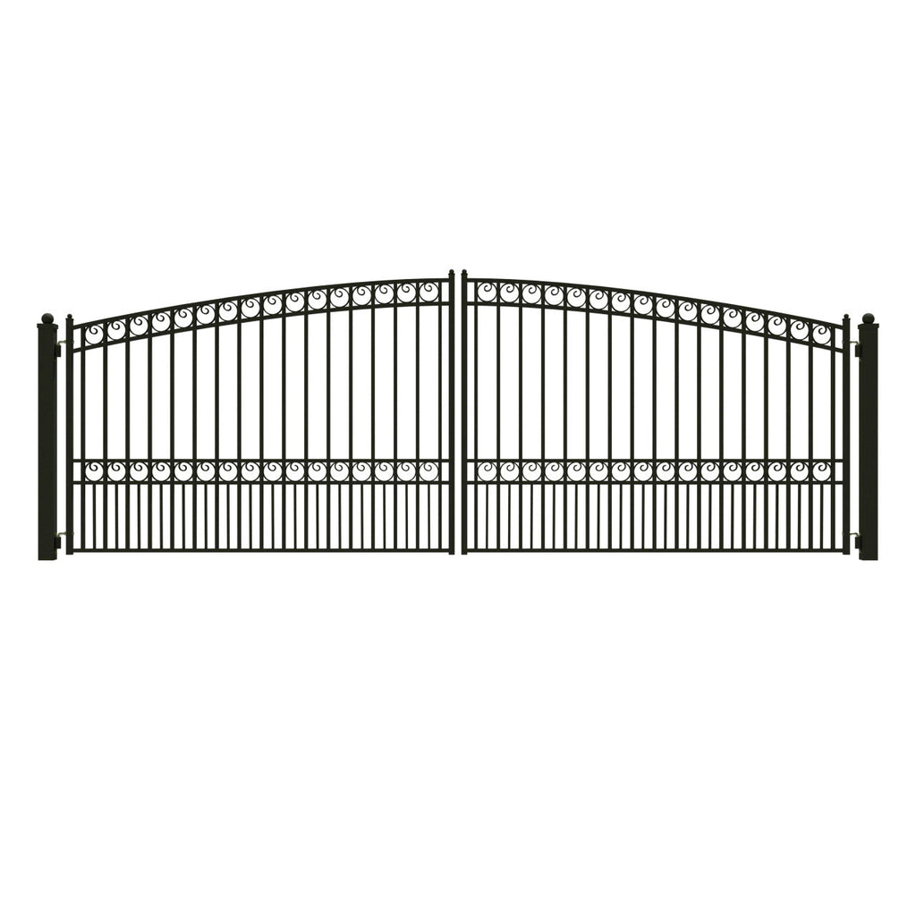 The 18'x6' Steel Dual Swing Driveway Gate in PARIS Style is built from hot-dip powder-coated galvanized steel for strength and long-lasting corrosion resistance. The gate dimensions are 18 x 6 feet, with sturdy posts measuring 8 feet tall and 3.5 x 3.5 inches wide. This elegant design adds both security and a touch of sophistication to any property.