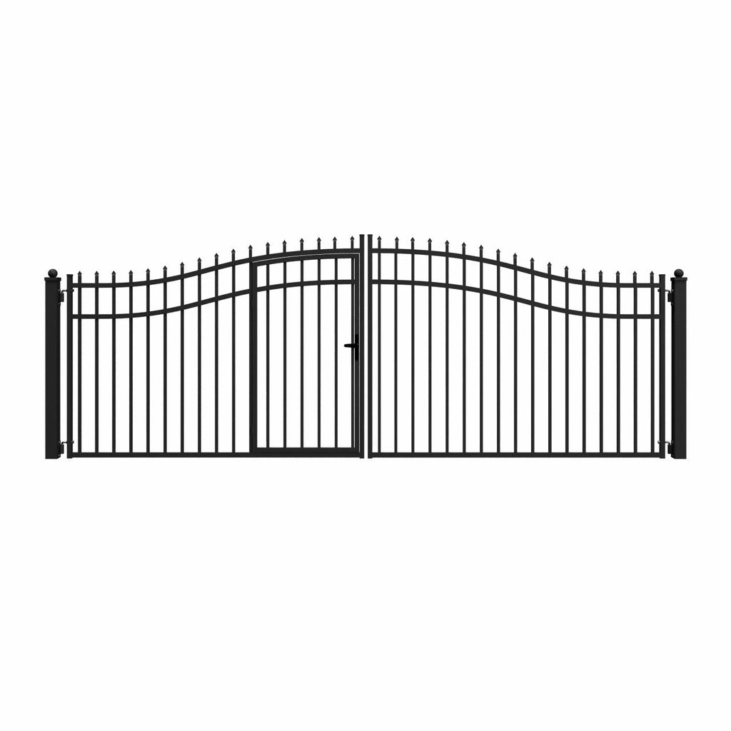 This 18'x7' Steel Dual Swing Driveway Gate offers exceptional strength and corrosion resistance with its hot-dip powder-coated galvanized steel construction. The gate features a built-in pedestrian door for easy access. With dimensions of 18 x 7.2 feet for the gate and a 9.4-foot tall, 3.2-inch wide post, this durable gate is designed for long-lasting performance and security.