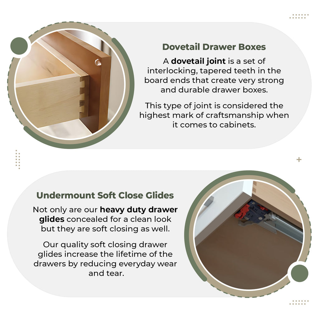 The frame of the door is similar in appearance to a picture frame. It is made of vertical stiles and horizontal rails. The solid wood doors are attached to the door frame with soft close adjustable European hinges. All our doors are larger than the cabinet door opening and sit on top of the frame for a full overlay design.