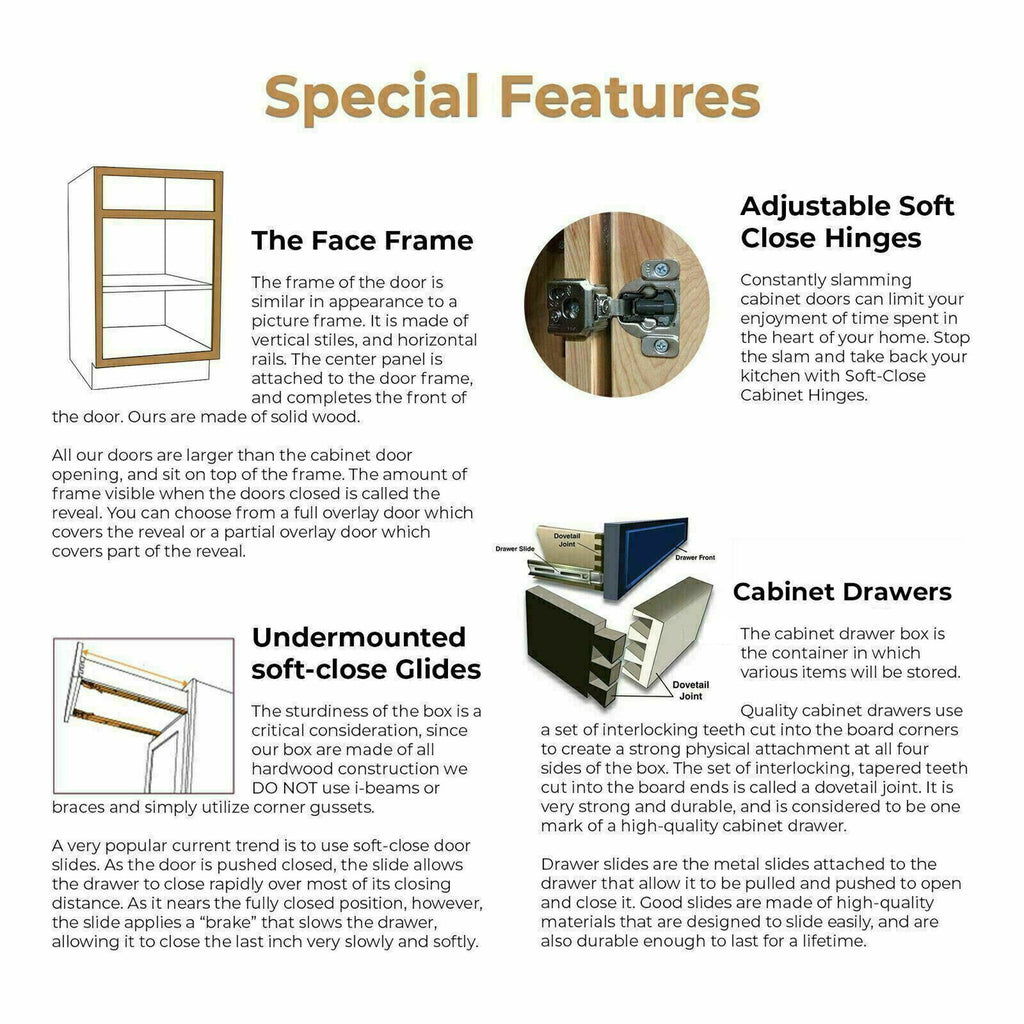 The frame of the door is similar in appearance to a picture frame. It is made of vertical stiles and horizontal rails. The solid wood doors are attached to the door frame with soft close adjustable European hinges. All our doors are larger than the cabinet door opening and sit on top of the frame for a full overlay design.