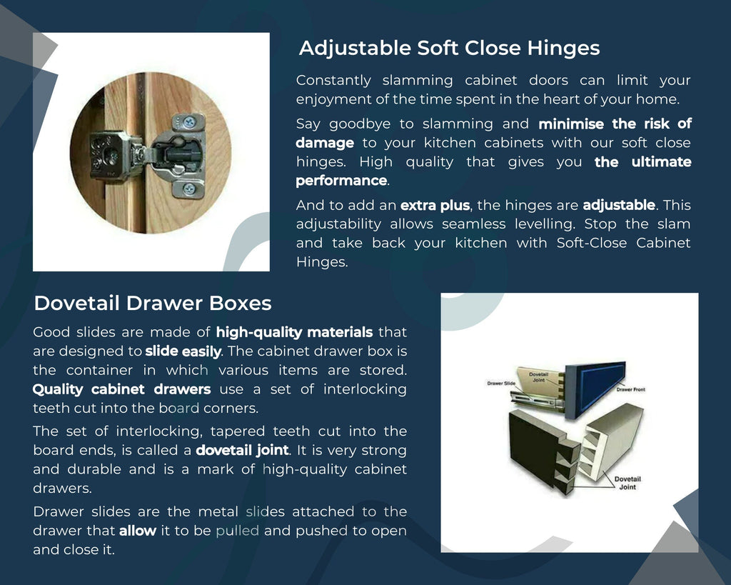 The frame of the door is similar in appearance to a picture frame. It is made of vertical stiles and horizontal rails. The solid wood doors are attached to the door frame with soft close adjustable European hinges. All our doors are larger than the cabinet door opening and sit on top of the frame for a full overlay design.