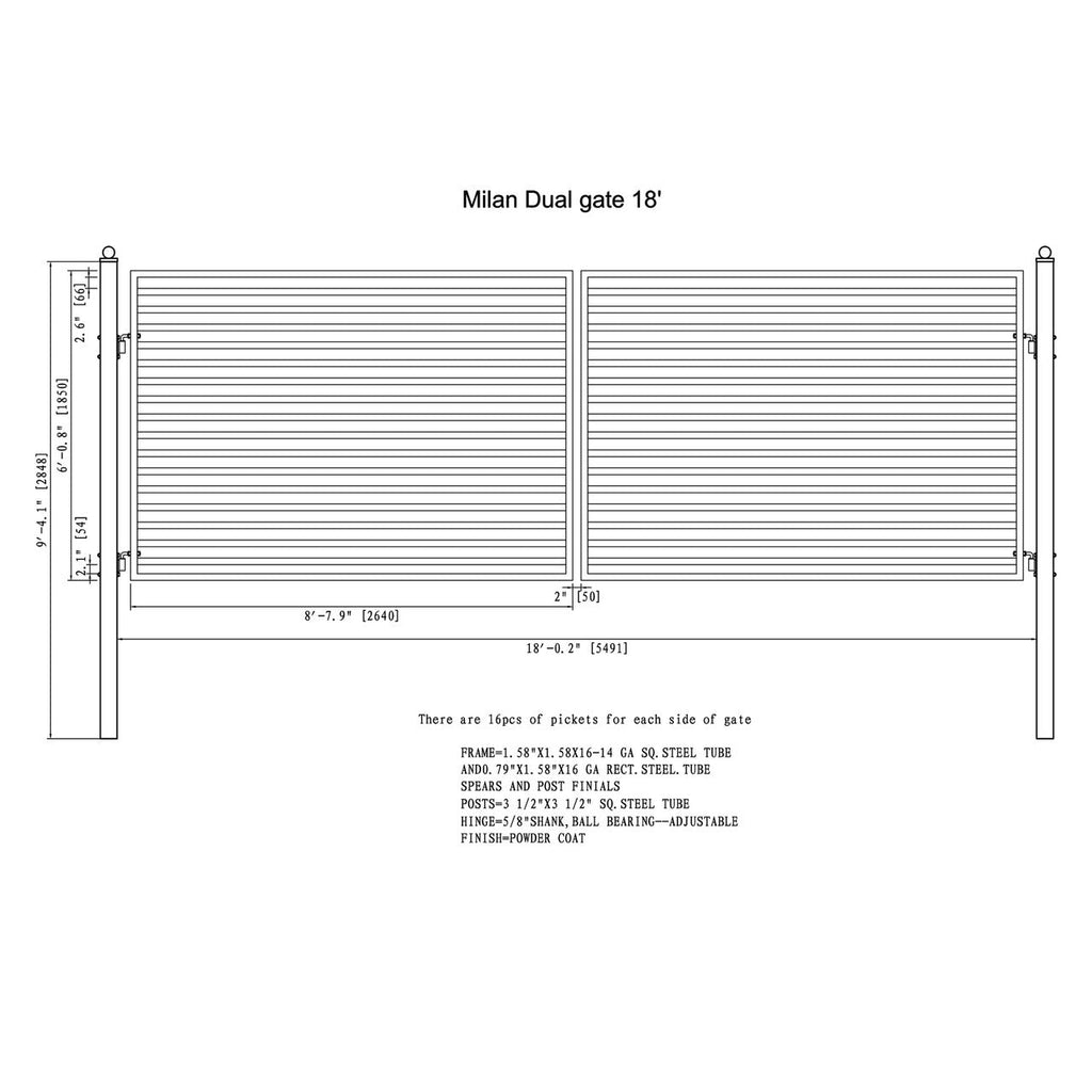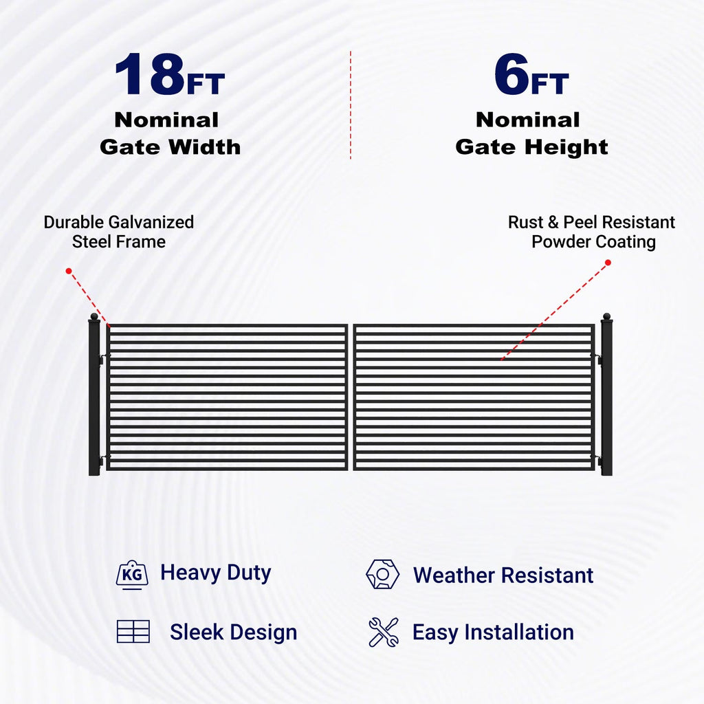 The 18'x6' Steel Dual Swing Driveway Gate in MILAN Style is made from hot-dip powder-coated galvanized steel for durability and corrosion resistance. Combining elegance and symmetry with a sleek, minimalist design, this gate adds a touch of sophistication to any property. Its timeless style offers both beauty and functionality, providing security while enhancing curb appeal.