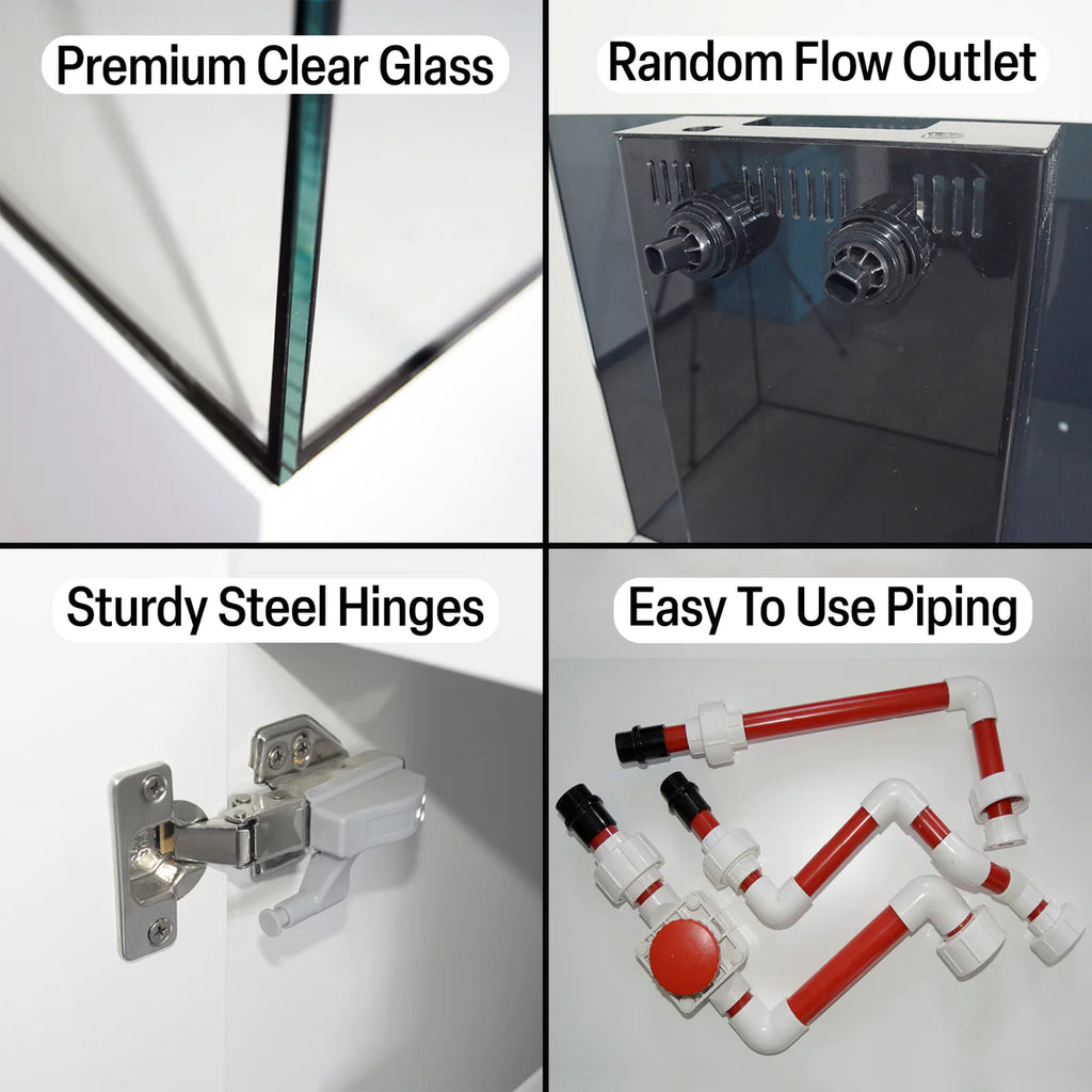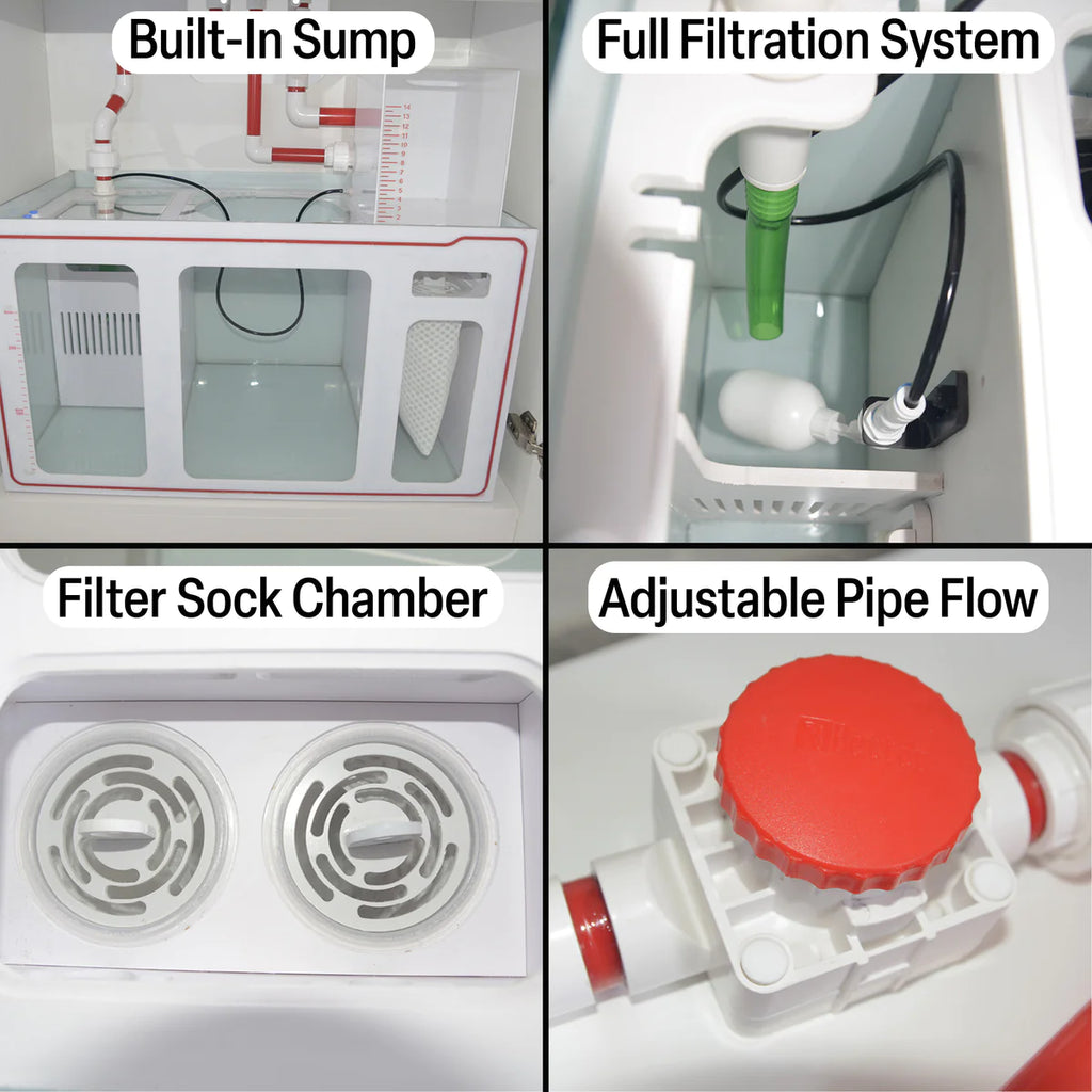 - CORAL SUMP: Your aquarium arrives with a sump system perfect for optimally filtering your coral reef tank. System includes a filter sock unit, protein skimmer/general use section, a top off reservoir, a section fit for your own choosing, and return pump section.