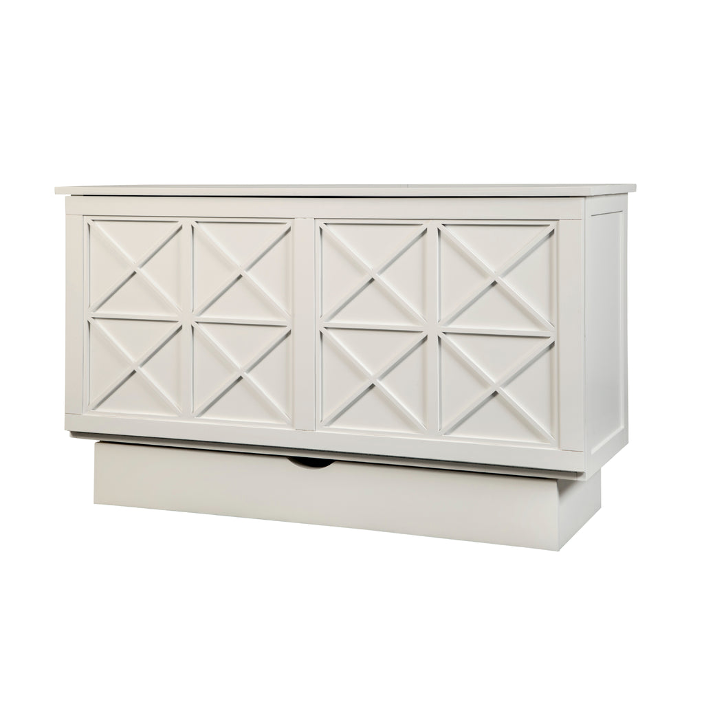 The Arason Creden-ZzZ Essex White Cabinet Bed-513-10 offers elegant design and smart functionality, making it the perfect solution for maximizing space. Featuring a charming crisscross molding reminiscent of Tudor-style windows, this beautiful cabinet bed adds classic sophistication to any room. Its innovative "Flip Top" design provides extra headroom while maintaining a low, easy-to-use surface—just slide items back and open the top effortlessly.