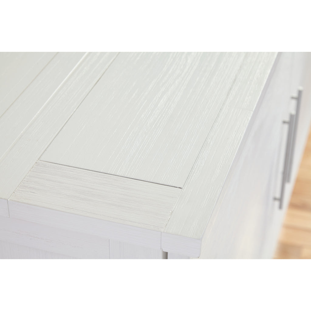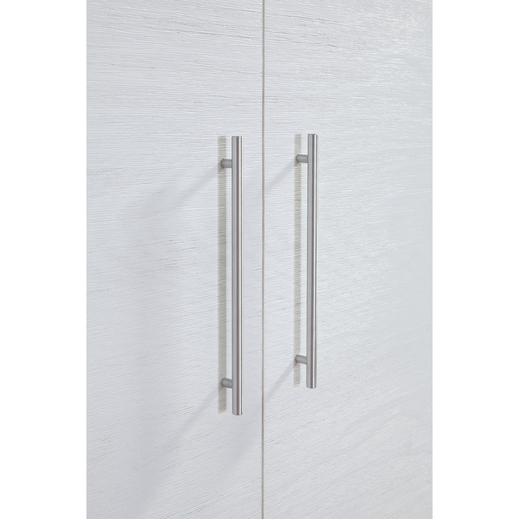Contemporary White Finish – Features a fresh wire-brushed finish on durable poplar veneer, complemented by 9.5″ brushed aluminum hardware
