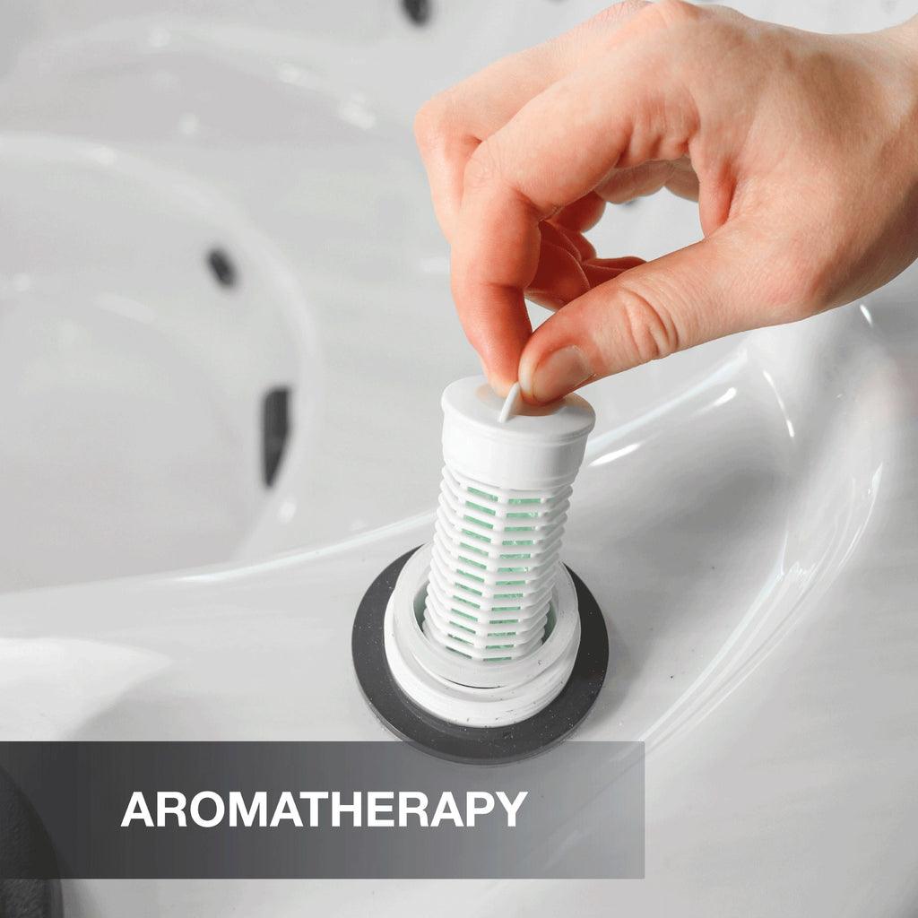 Features perimeter multi-coloured LED mood lighting, cascading waterfall, and built-in aromatherapy canister