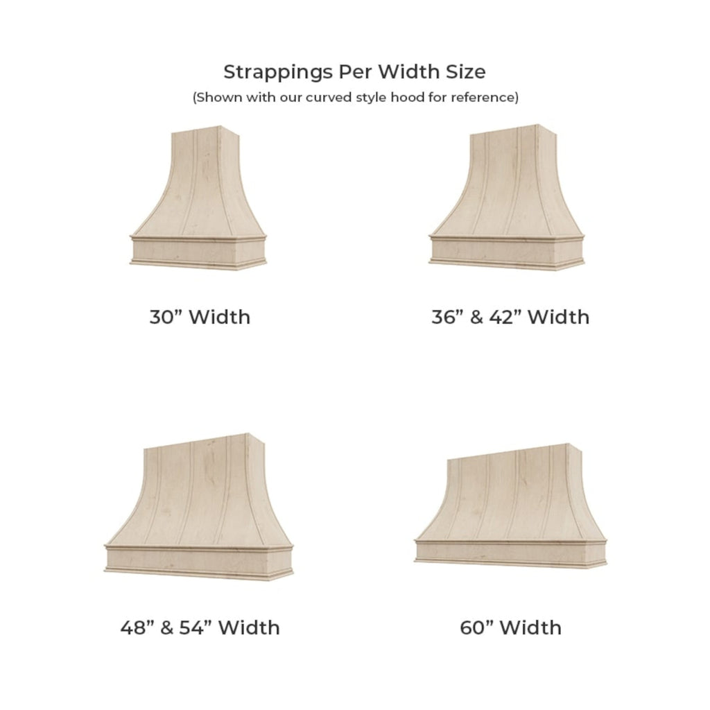 Chocolate Wood Range Hood With Tapered Strapped Front and Block Trim - 30", 36", 42", 48", 54" and 60" Widths Available