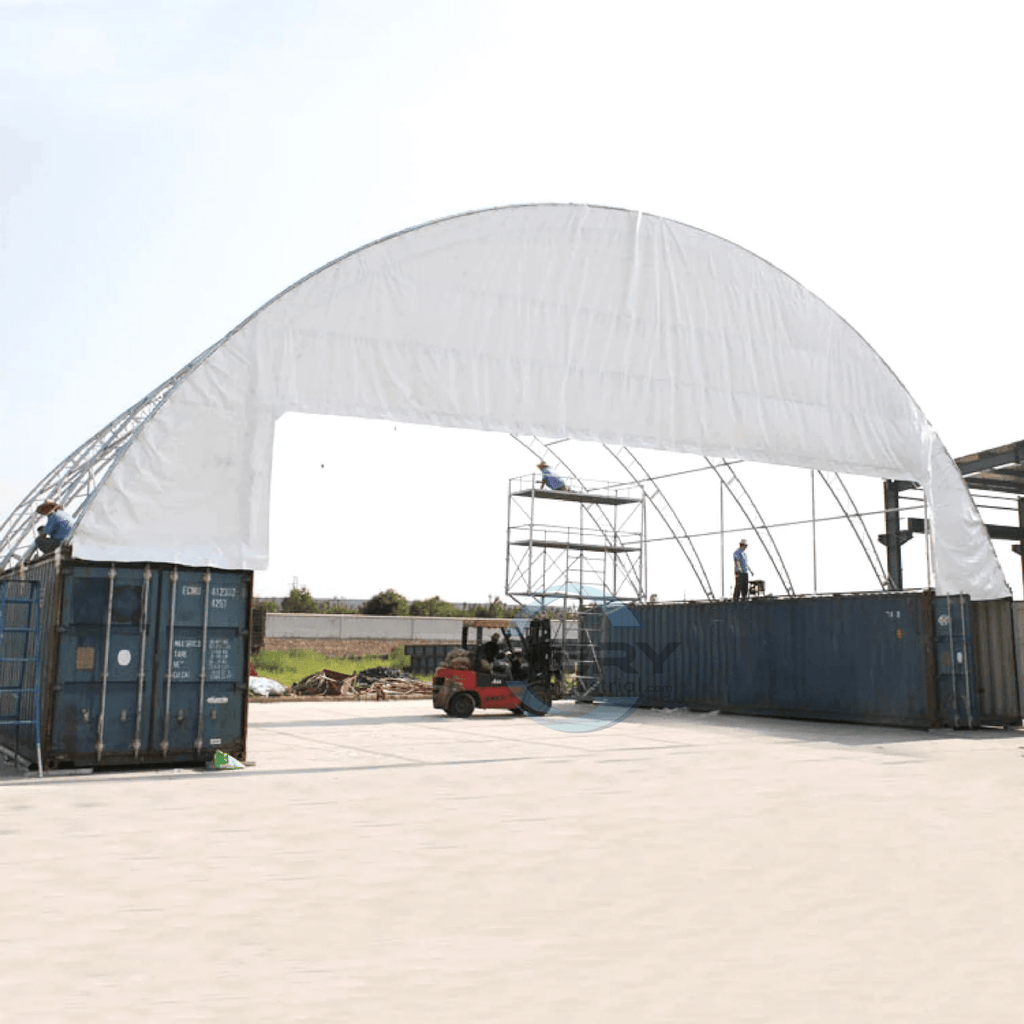 Introducing the Container Shelter: a remarkable fusion of innovation and practicality that sets a new standard for outdoor coverage. Standing at an impressive 60'x40'x20', the Double Truss Shipping Container Canopy Shelter redefines the realm of protection and versatility. Crafted to address a myriad of needs, this cutting-edge shelter promises to revolutionize the way we safeguard assets, projects, and events against the elements.