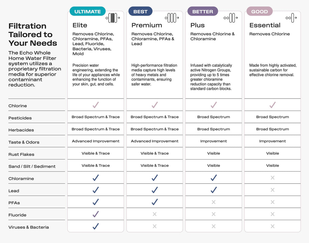 Ensure clean, fresh-tasting water throughout your entire home with the Echo Whole Home Water Filtration System, powered by Crusader. Designed to effectively reduce chlorine, and unwanted tastes and odors, this advanced system delivers high-performance filtration with minimal maintenance.