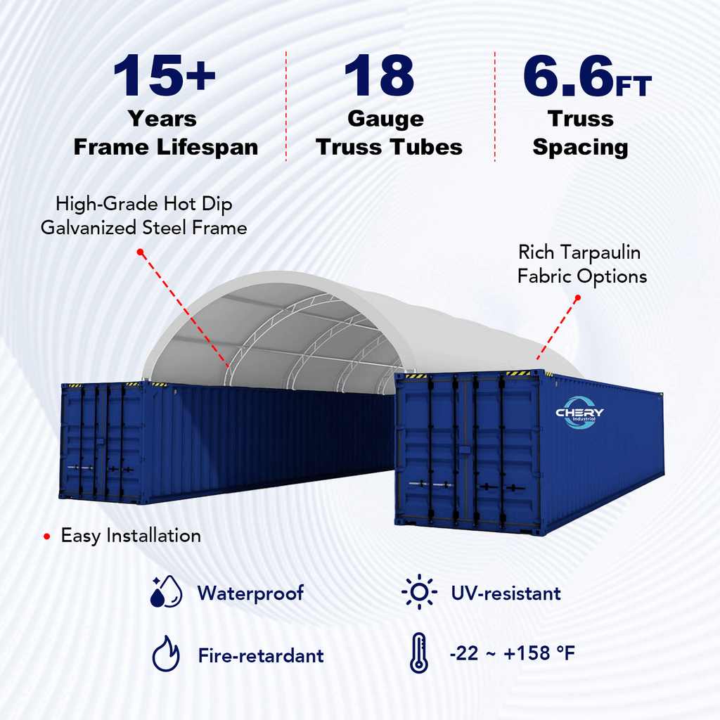The Fortified 20'x40' Double Truss Container Shelter features a reinforced structure for enhanced stability and wind resistance, making it stronger than standard models. Designed for heavy-duty protection, it offers superior durability against harsh weather conditions. Easy to install on shipping containers, this shelter provides reliable, long-term coverage for equipment, vehicles, and materials in industrial, agricultural, and commercial settings.