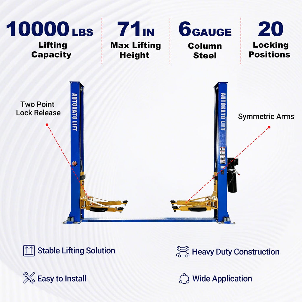 Introducing the KT-H105 Two Post Vehicle Lift, a pinnacle of automotive lifting precision. With symmetrical lifting arms and a robust 10,000 lbs capacity, it ensures a secure and balanced elevation for diverse vehicles. The cutting-edge bilateral unlocking system guarantees synchronized control, prioritizing safety during every lift. Ideal for professional garages and DIY enthusiasts, the KT-H105 excels in various scenarios, from routine maintenance to tire rotations. Versatile and efficient, its design accommodates a spectrum of vehicles, providing unparalleled support for automotive tasks. Elevate your garage experience with the reliability and precision of the KT-H105 Two Post Vehicle Lift.
