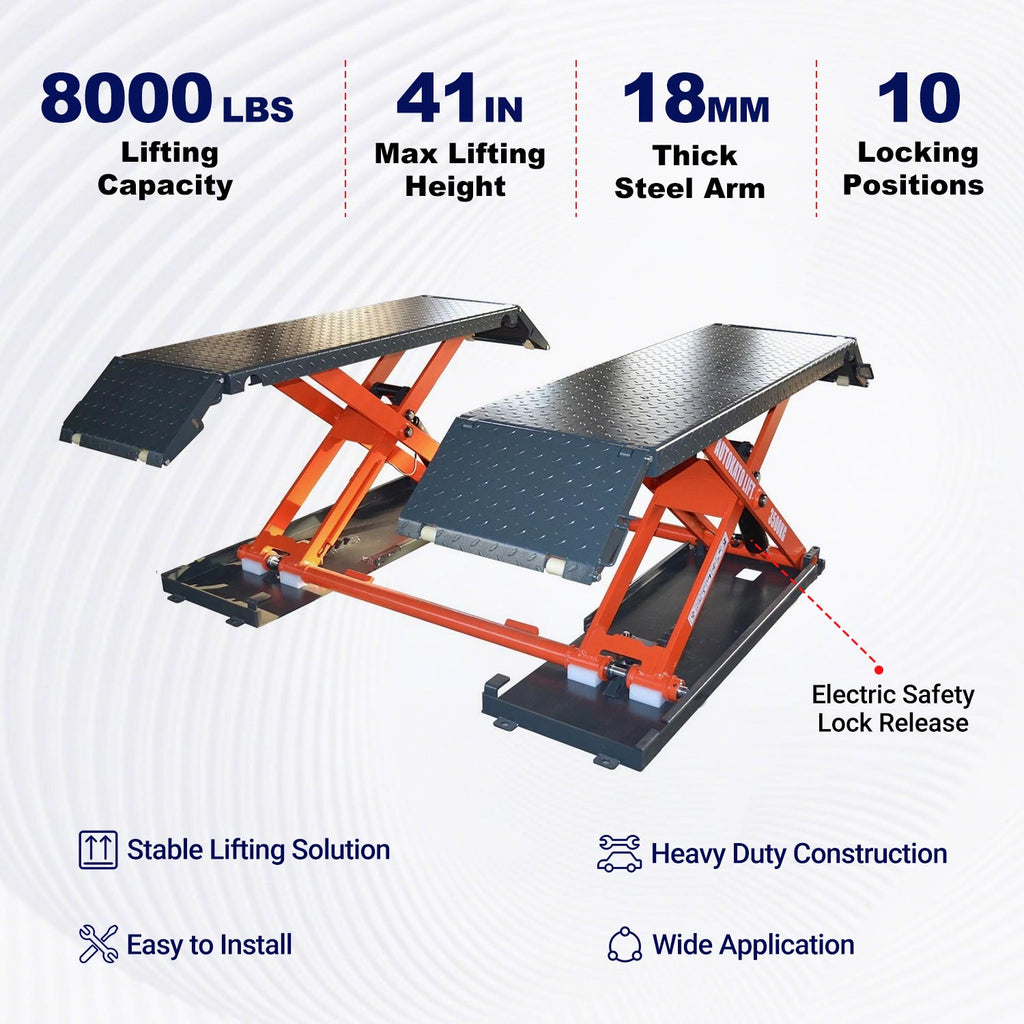 Unlock unparalleled versatility with the KT-X85 Mid-Rise Scissor Lift, now available in two voltage variations – choose the power that suits your garage, 110V or 220V. Elevate your automotive maintenance game with this compact powerhouse, offering effortless lifting for tire changes, brake repairs, and more. The electric precision release ensures controlled elevation, while the dual voltage options cater to diverse workspace requirements. Whether you're a dedicated DIY enthusiast or a professional mechanic, the KT-X85 delivers reliability and adaptability in one dynamic package. Upgrade your lifting experience and enjoy the freedom to choose with the KT-X85 Mid-Rise Scissor Lift – where power meets precision.