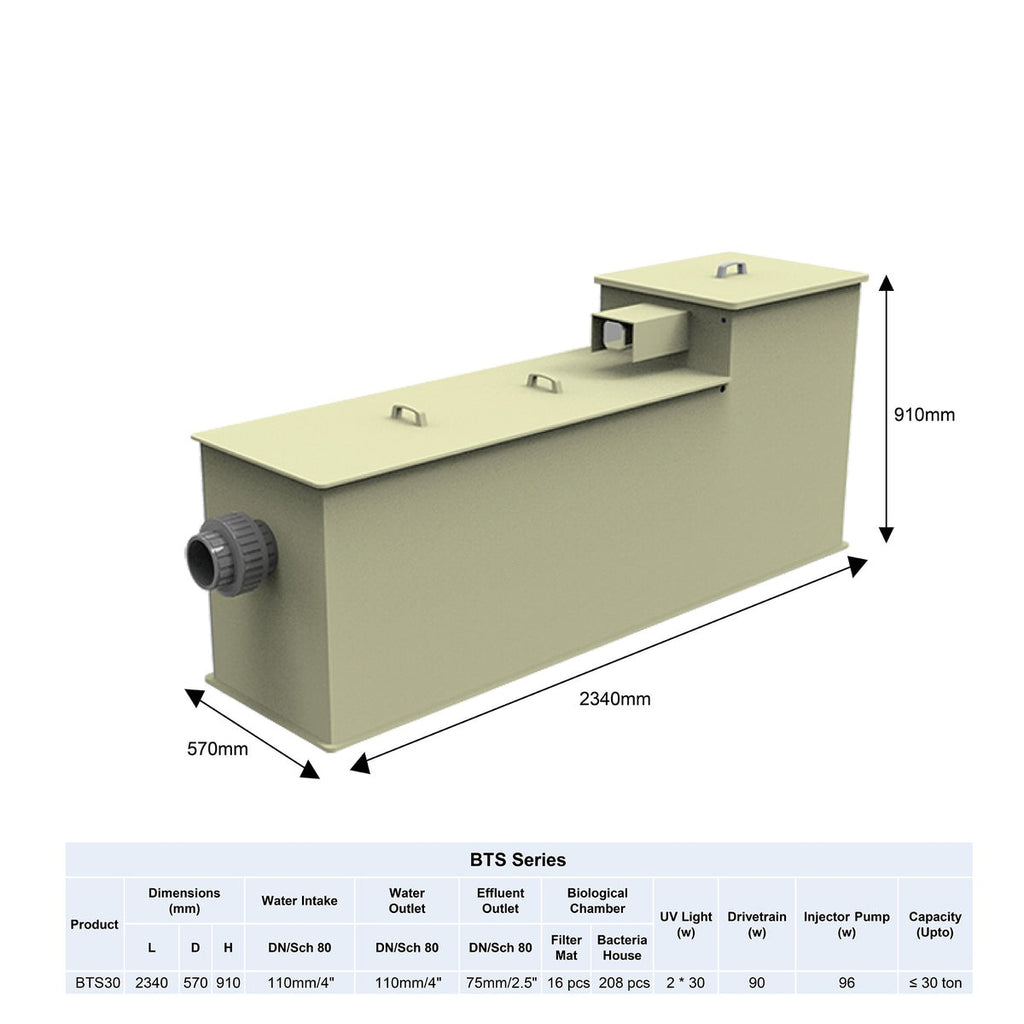 - Product size of 30T+filter bin+UV30W*2 is 2337*568*906mm; water intake DN100(110mm); outlet DN100(110mm); sewage outlet DN65(75mm); motor power 9W; pump power A80/96W;Biochemical warehouse size 480*330*408mm.