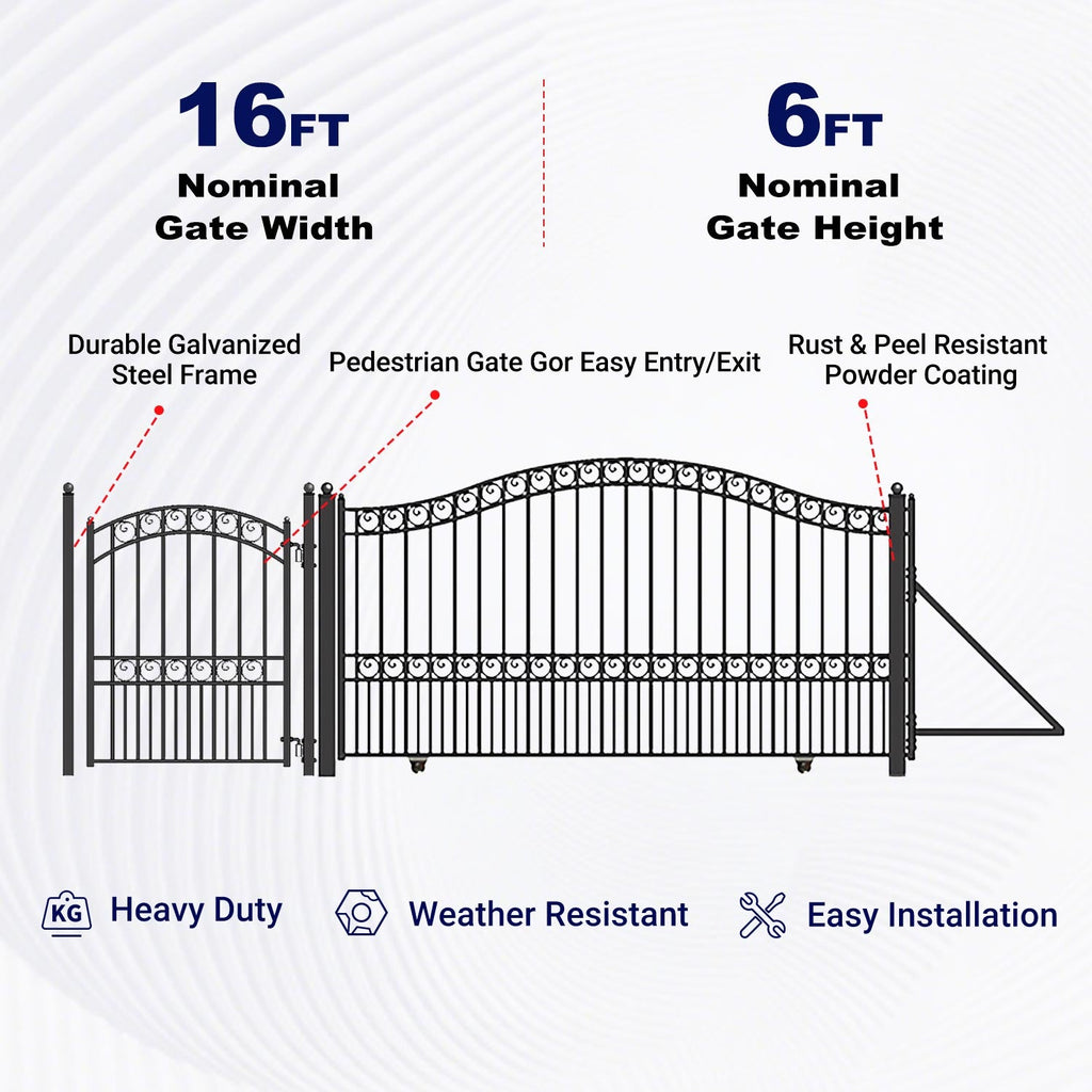 - Versatile: Can be used for entryways, backyards, pool areas, storage facilities, farms, commercial, or residential properties needing a wide gate enclosure; install as a complete set or separately on your property.