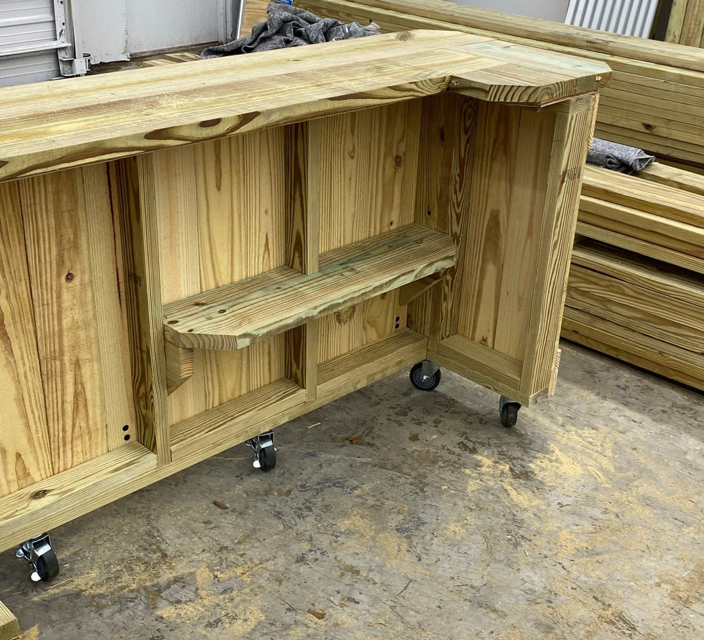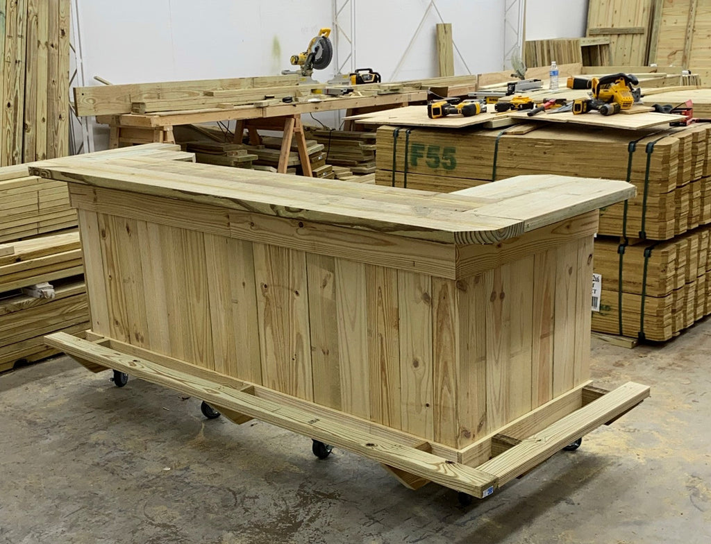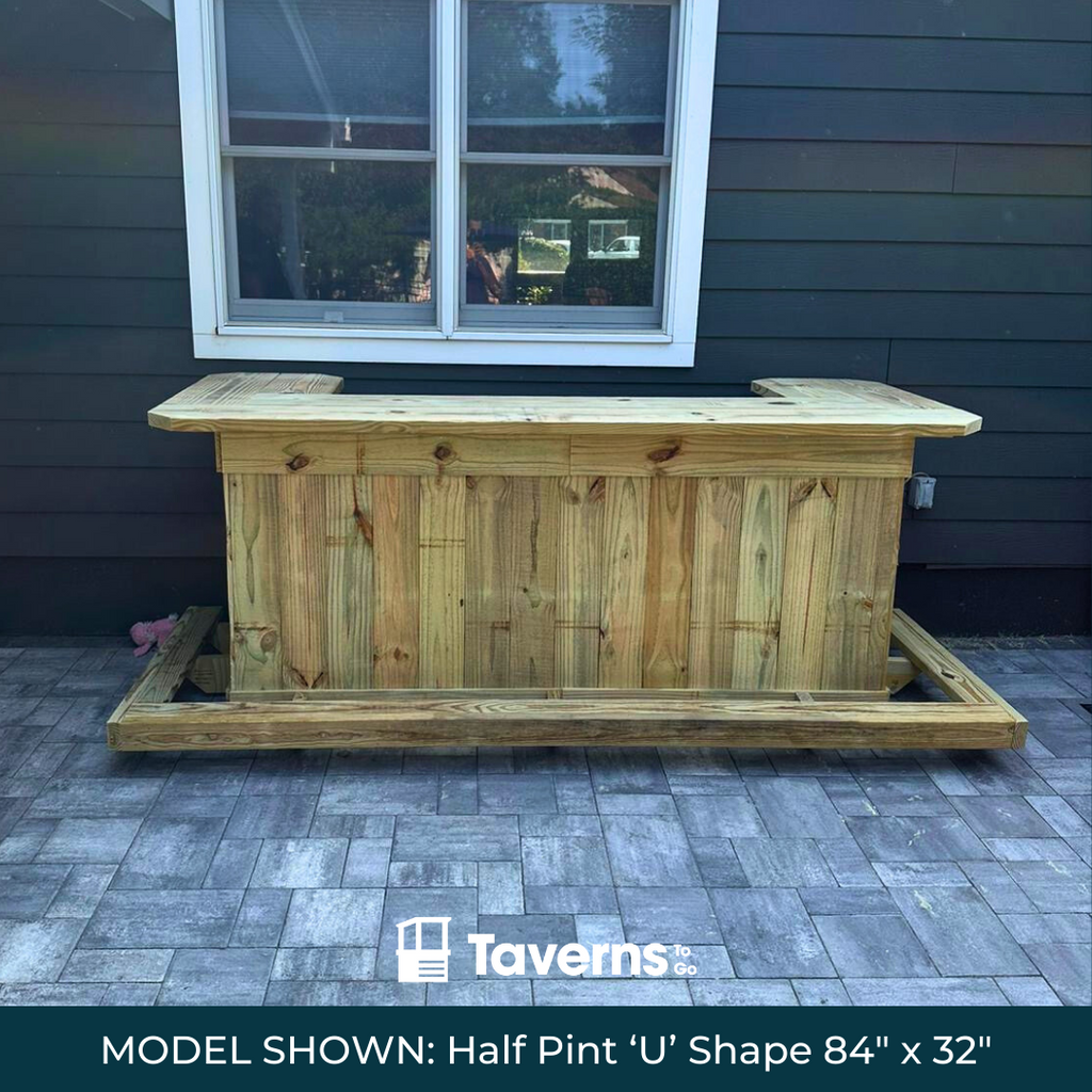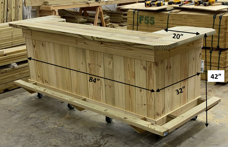 Prefer a more simple bar, with the added benefit of easy moving?... Check out the Half Pint bar; overall size 84" long x 32" wide sitting on lockable casters creating a bar top height of 42".