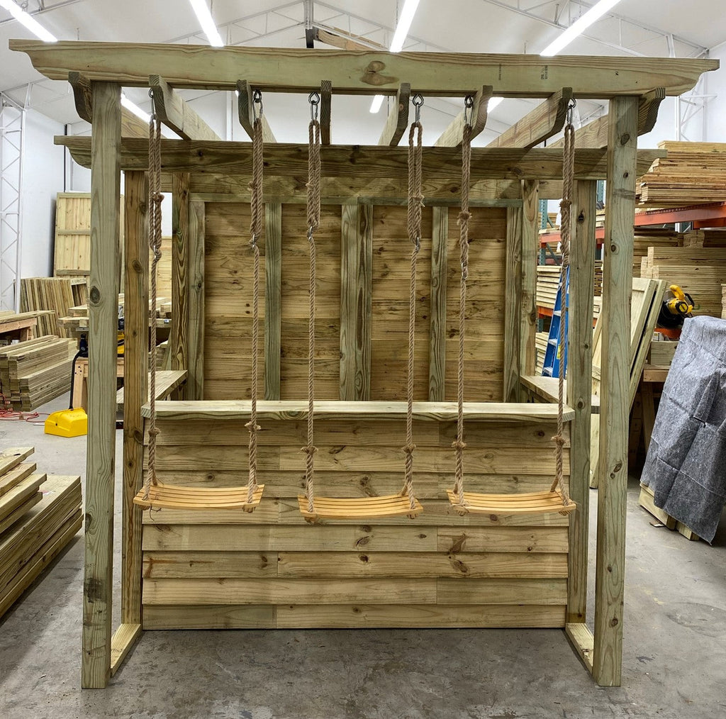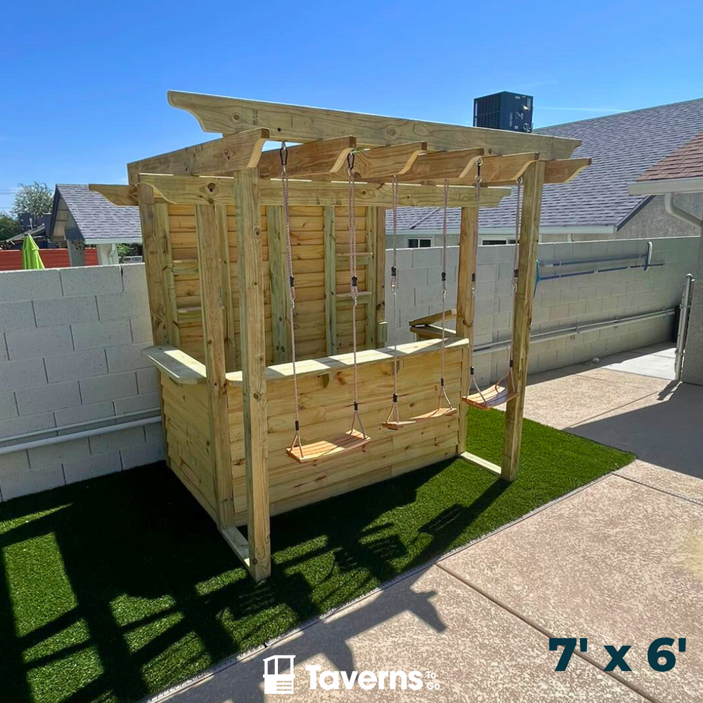 Swing up your bar game with an outdoor bar with built-in swings! This model is available in our original design with corrugated roofing, or with a pergola roof.