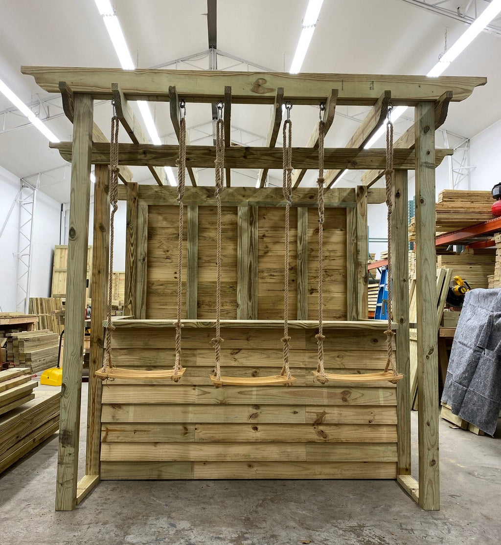 10' wide x 7' deep; (4) swings with 10' x 5' bar plus a 1'-9" extension to the front to support the swing sets