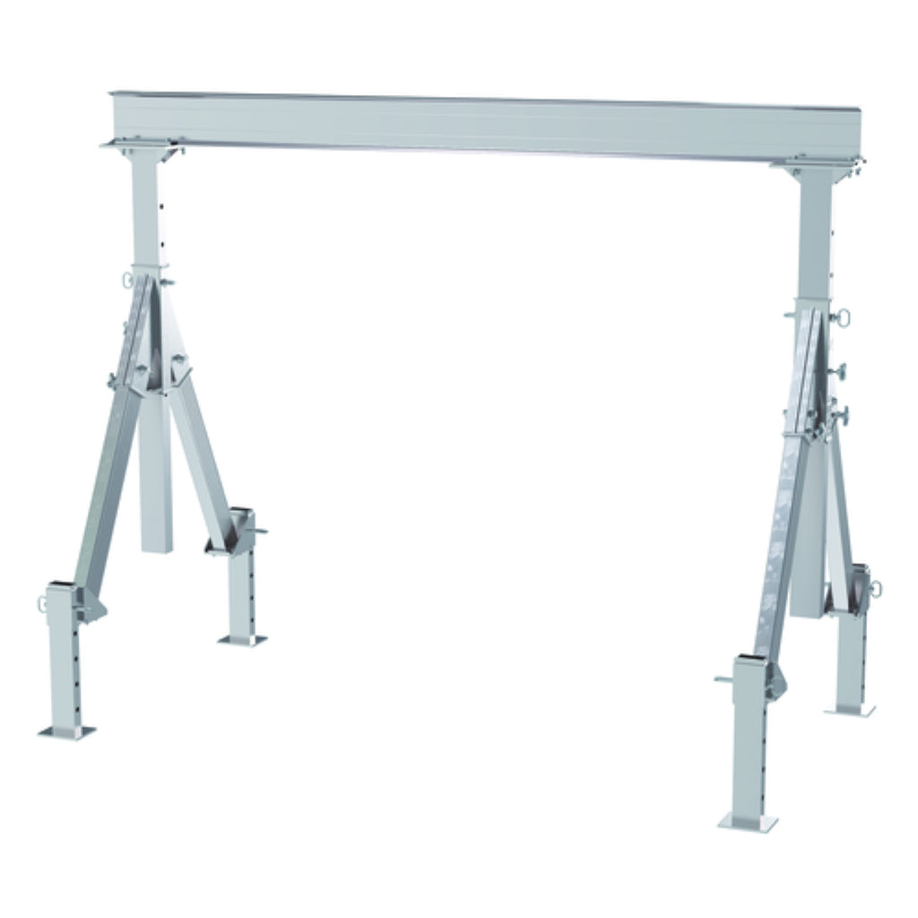 An adjustable height aluminum gantry crane is a valuable asset in warehousing and manufacturing settings. The crane has an all-aluminum construction making it corrosion resistant and perfect for outdoor use. All pinned connections make it possible for personnel to set up and take down in just minutes. The adjustable leveling legs allow the crane to be raised or lowered in 4" increments on uneven surfaces. Each leg has a pin style adjustment design with pre drilled alteration holes. With a rectangle shaped base included on each leg, the crane has a strong foundational support.