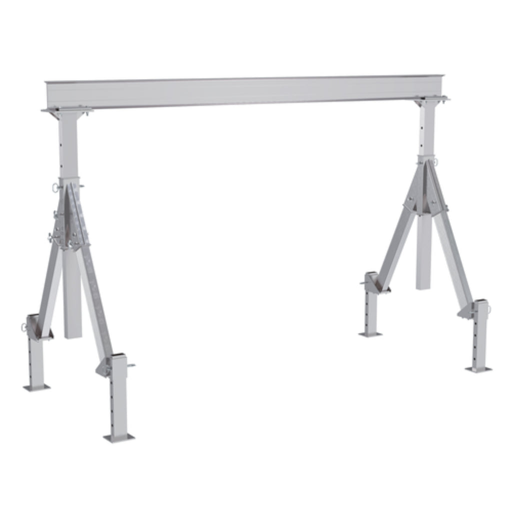 An adjustable height aluminum gantry crane is a valuable asset in warehousing and manufacturing settings. The crane has an all-aluminum construction making it corrosion resistant and perfect for outdoor use. All pinned connections make it possible for personnel to set up and take down in just minutes. The adjustable leveling legs allow the crane to be raised or lowered in 4" increments on uneven surfaces. Each leg has a pin style adjustment design with pre drilled alteration holes. With a rectangle shaped base included on each leg, the crane has a strong foundational support.