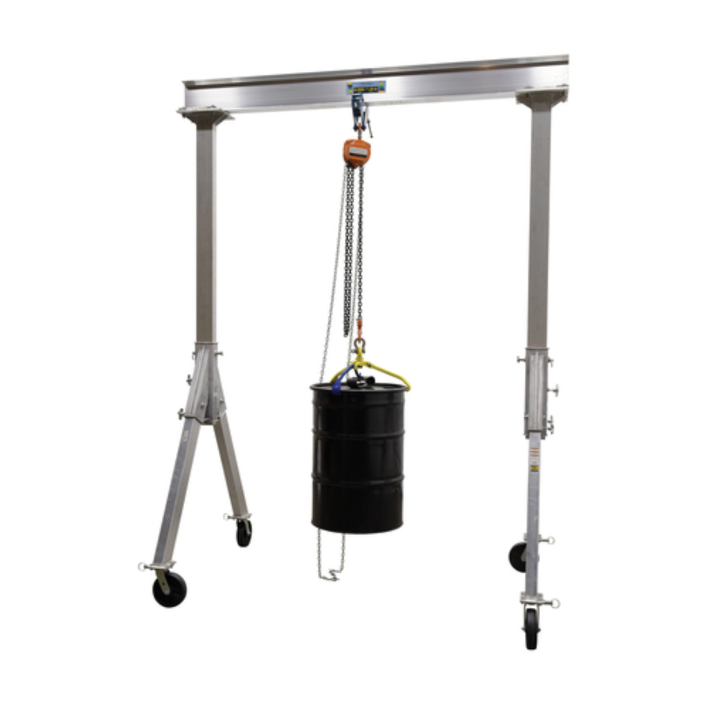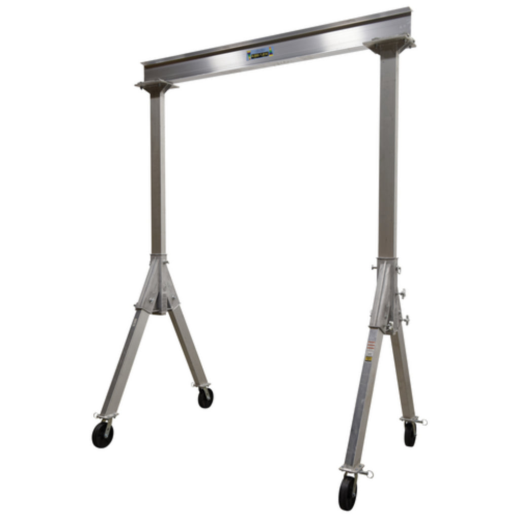 The fixed height Aluminum Gantry cranes are ideal for the manufacturing and maintenance facilities. The aluminum construction is easily manageable and can be simply assembled for immediate use. The unit has a fixed height for working in a permanent or semi-permanent environment. The casters allow the user to move the crane from workstation to workstation and smoothly roll over rough surfaces, while not marring. Do not move units while loaded.