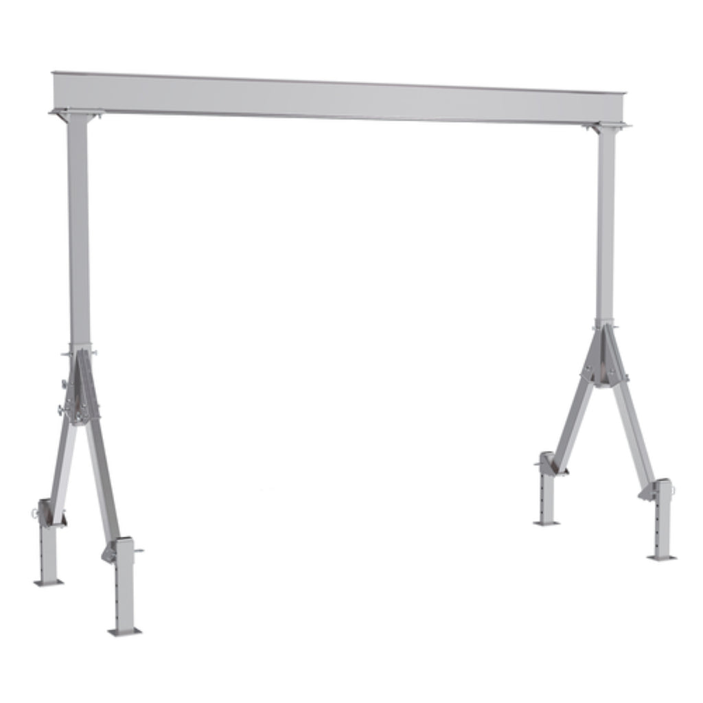 A fixed height aluminum gantry crane is a valuable asset in warehousing and manufacturing settings. The crane has an all-aluminum construction making it corrosion resistant and perfect for outdoor use. The fixed height gives the user consistent familiarity when raising/lowering items. If a change in height is needed, the adjustable legs allow the crane to be raised or lowered in 4" increments. Each leg has a pin style adjustment design with pre drilled alteration holes. With a rectangle shaped base included on each leg, the crane has a strong foundational support.