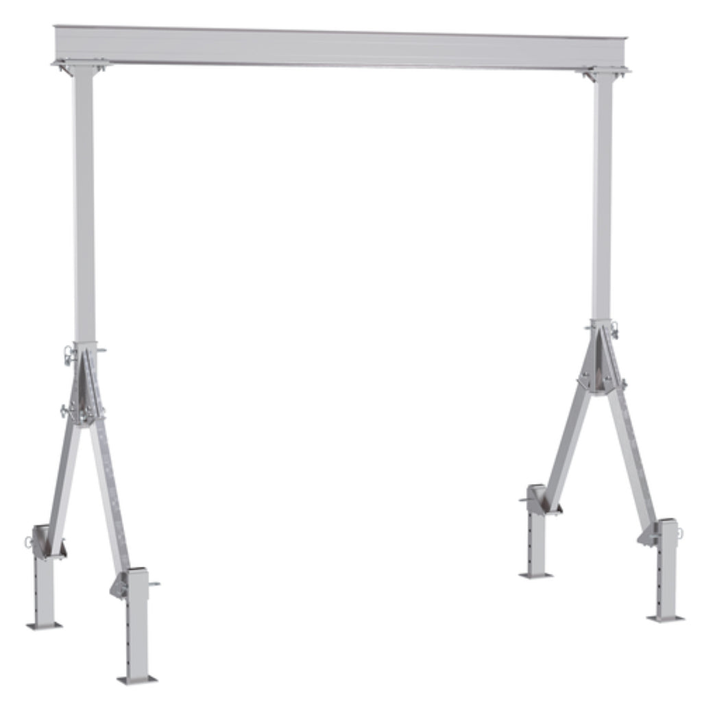A fixed height aluminum gantry crane is a valuable asset in warehousing and manufacturing settings. The crane has an all-aluminum construction making it corrosion resistant and perfect for outdoor use. The fixed height gives the user consistent familiarity when raising/lowering items. If a change in height is needed, the adjustable legs allow the crane to be raised or lowered in 4" increments. Each leg has a pin style adjustment design with pre drilled alteration holes. With a rectangle shaped base included on each leg, the crane has a strong foundational support.