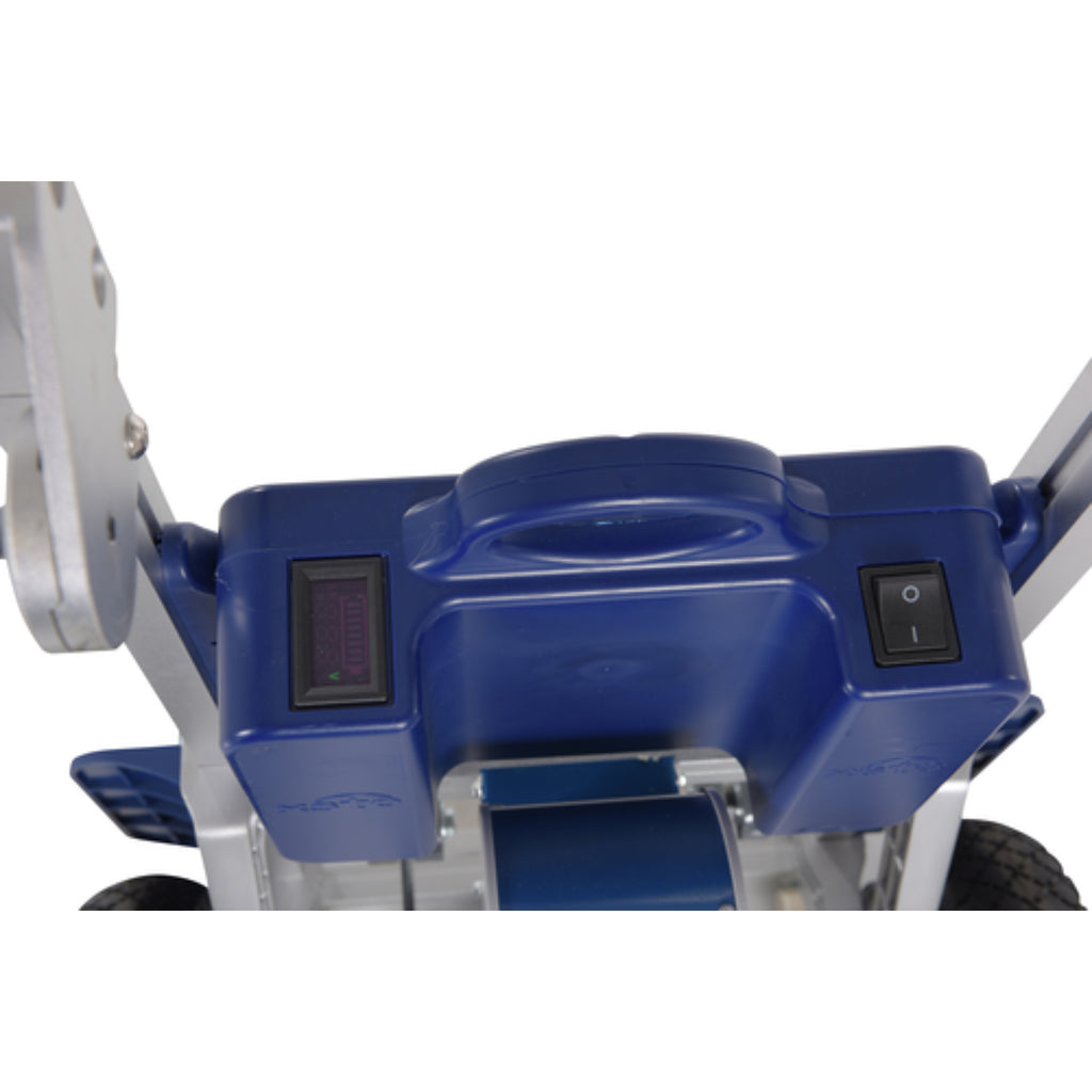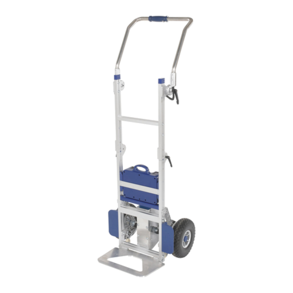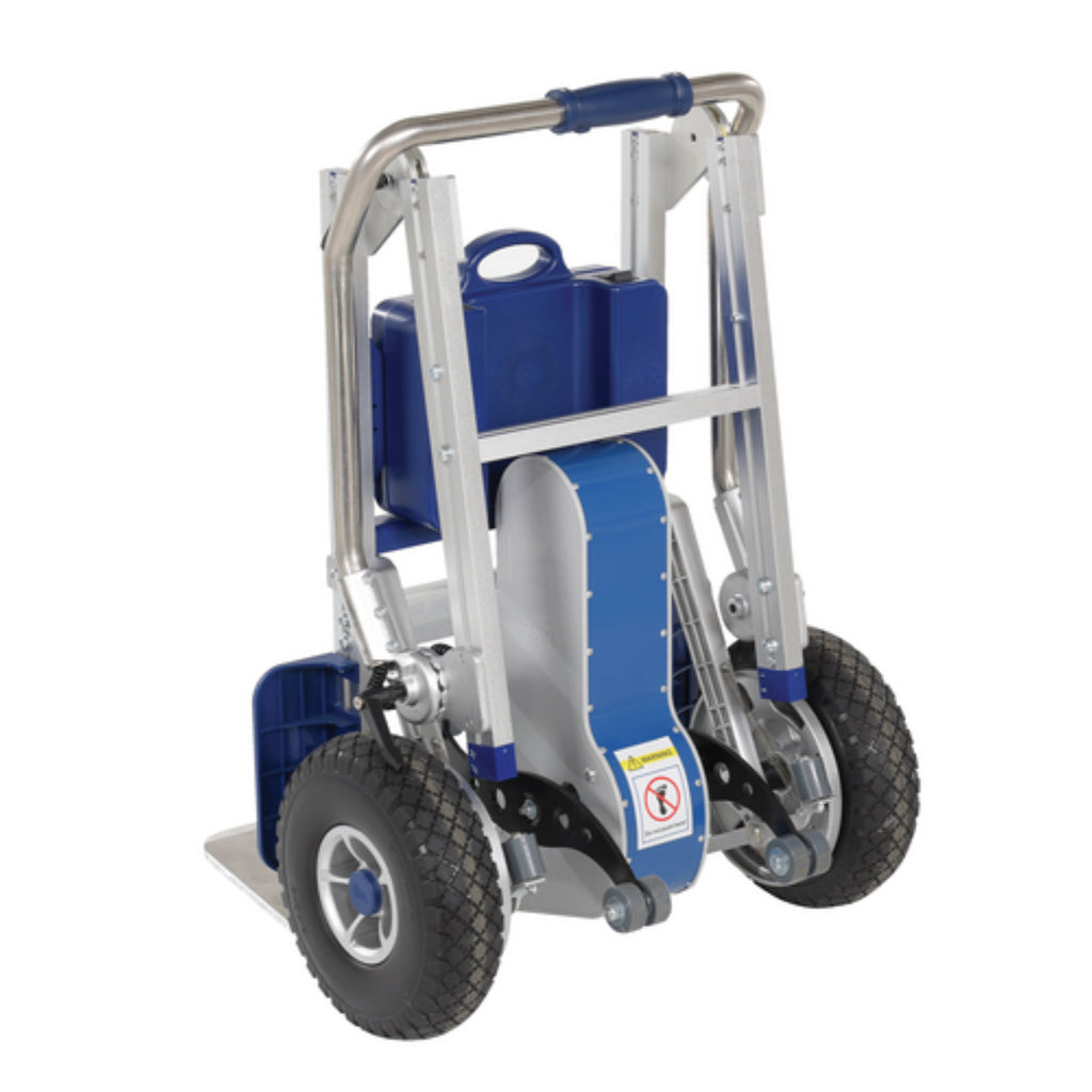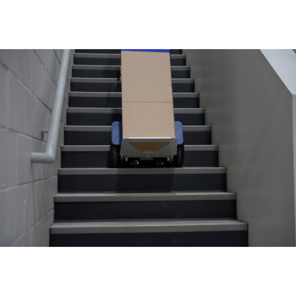 When objects are required to be moved up or down flights of stairs, the powered stair climber is the perfect asset. With the large ergonomic handle and tall upright aluminum alloy structure, a single user can transport goods with ease. A wide platform base gives the user the opportunity to transfer a variety of items whether they are heavy, light, large or small. When transferring goods down a set if stairs, the brake is automatically applied to ensure safety and consistent speed of movement. The powered design increases user safety and minimizes the labor associated with moving awkward items. This powered stair climber has two raise/lowering speeds. When not in use, the cart folds into a very compact design that is perfect for transporting in vehicles or storing away in closets. Large polyurethane wheel make traversing over a variety of surfaces as simple as can be.