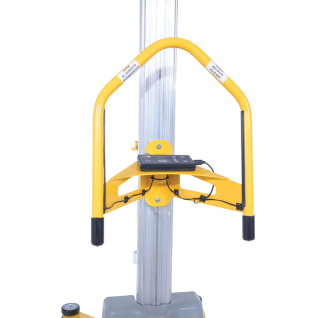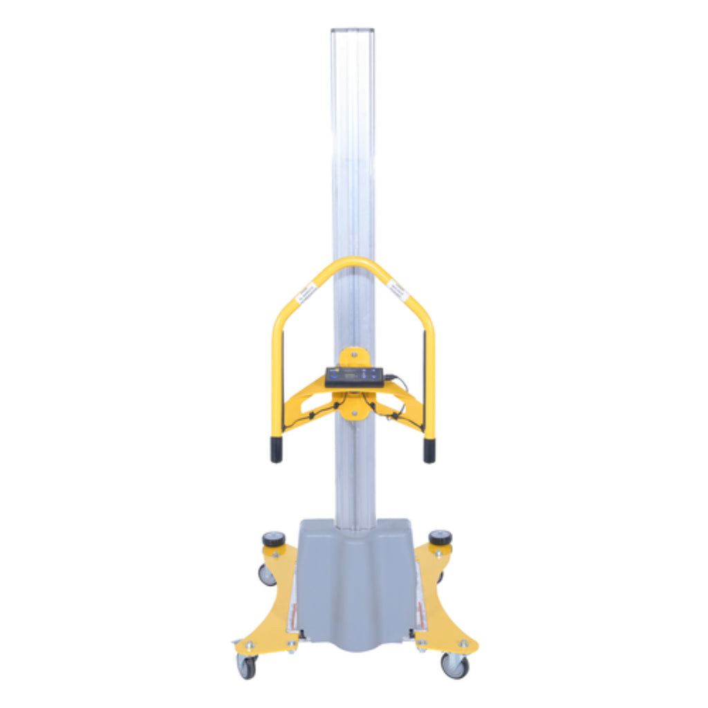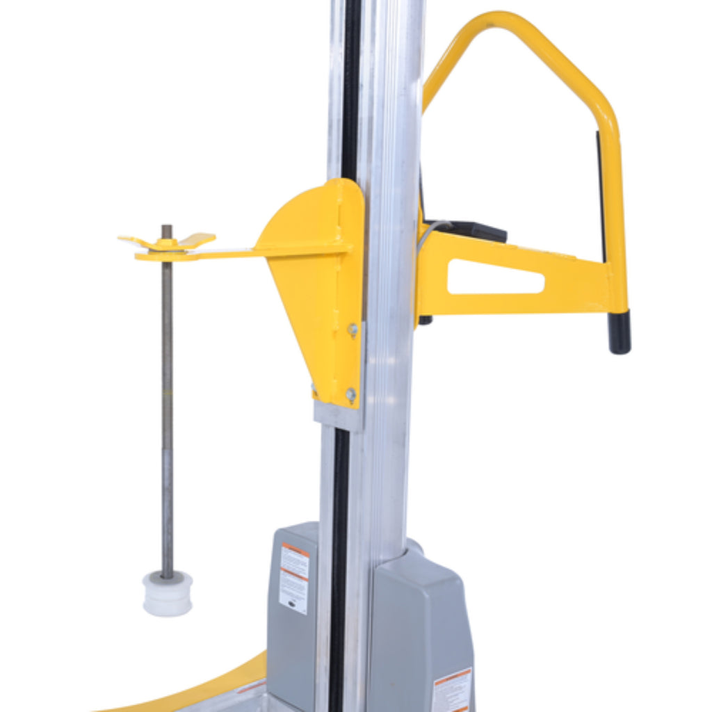 The material pallet stretch wrap machine provides the flexibility to apply stretch wrap film at any work station. This portable walk around stretch wrapper has electronic touch sensitive controls to make packaging tasks easier. Powerful DC battery powered lift moves film wrap up and down as operator simply walks around the packages. Designed to help wrap large and tall packages that could not be wrapped on the standard carousel stretch wrappers. Features an easy reload film system. The upright is constructed of aluminum while the rest is steel construction with powder coat yellow finish. Film not included.