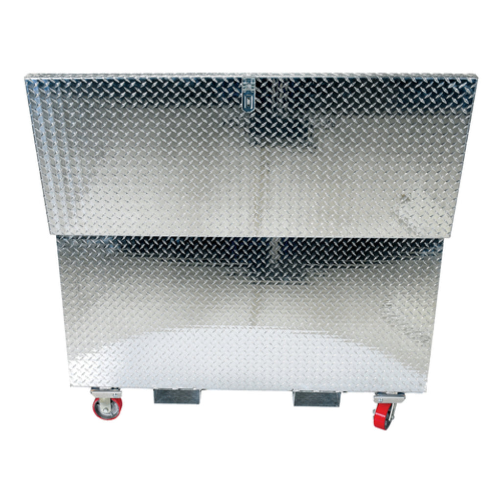 The Aluminum portable toolbox is excellent for storing and transporting equipment. The heavy duty welded aluminum tread plate construction is designed to tolerate the toughest of environments. Additional features also include ergonomically friendly carrying handles on each end for smooth manual transporting and a hinged lid which includes a lockable double hinged hasp for added security. Casters are included for simple portability between work areas. Fork pockets are attached to the units underbelly for lifting and maneuvering between areas.