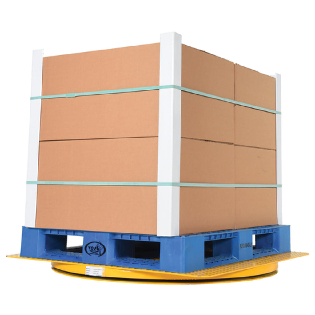 The heavy-duty king pin carousel has all the ergonomic benefits of the standard carousel with a top plate and stabilizing center pin. This carousel will handle a wider variety of loads and includes a heavy-duty maintenance free bearing. The king pin design allows off set loading up to fifty (50) percent of the capacity on at least fifty (50) percent of the deck. Standard top plates are square with rounded corners.