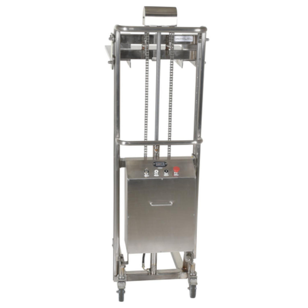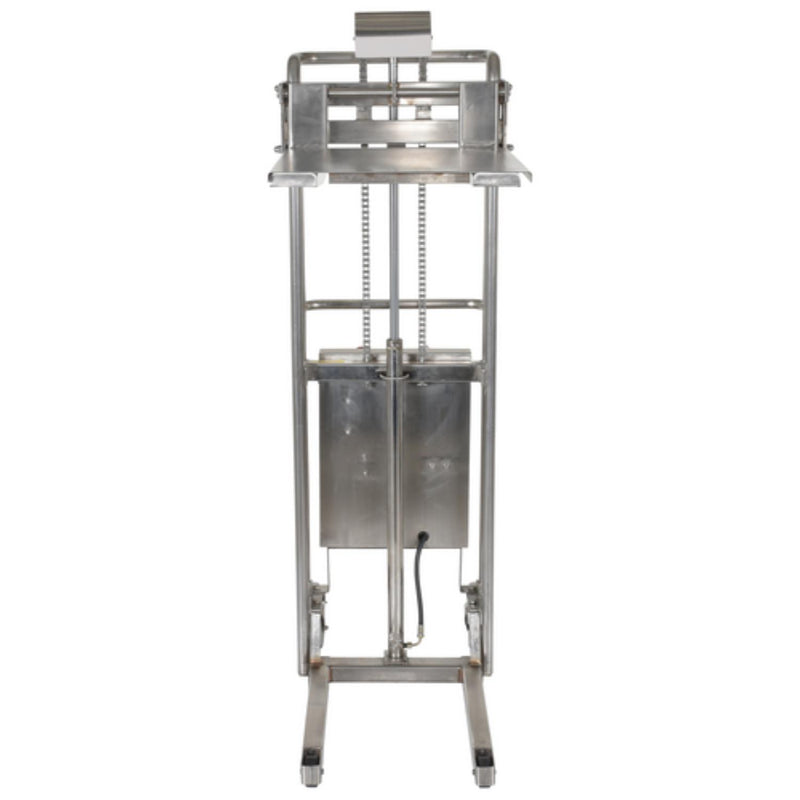 The Hefti-Lift is a user friendly, portable hydraulic lift. The lift provides reliable, power lifting when moving and positioning loads. It includes a removable platform for operation requiring forks. The non-slip chain is used for accurate positioning while the lift rolls easily on two rigid and two swivel poly-on-steel casters that includes a foot operated brake. The unit has an all welded construction with a chrome platform and uprights. Not for use with pallets.