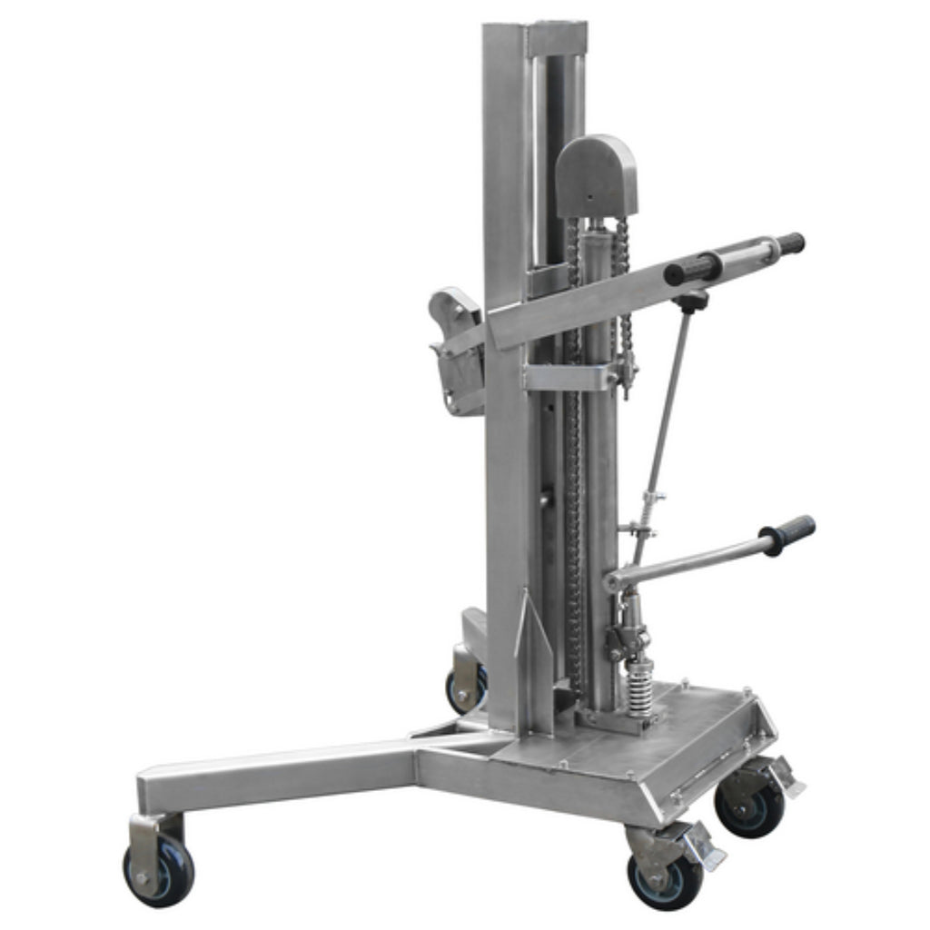 The stainless steel hydraulic drum lifter is designed to allow the operator to load or unload drums on and off the corner of pallets. Straddle leg design allows the drum lifter to glide over standard pallets and grab most 30, 55, or 85 gallon steel and poly drums. Drums are raised and lowered easily using the foot pump. 304 Grade all stainless steel construction. Ideal for wash-down, pharmaceutical, and clean room applications.