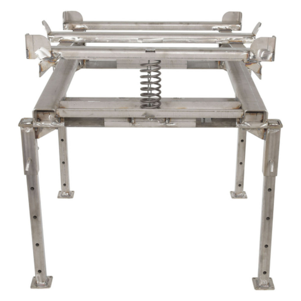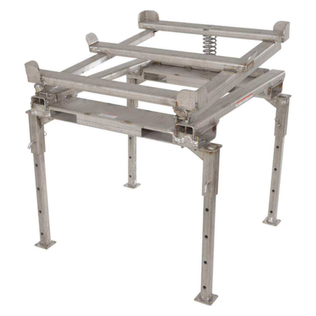 An intermediate bulk container tilt support stand is designed to provide a secure tilting of containers for complete draining. Anchor all 4 legs to the ground with 3/8" X 4" (L) anchor bolts. The adjustable height of the stand allows for easy access to valve connections and minimizes user bending and twisting. To use, simply place the container on the stand. When the container is in the secure position, start the draining process. As the fluid flows from the container, the rear of the stand platform will rise up creating an angle for a better release of fluids.