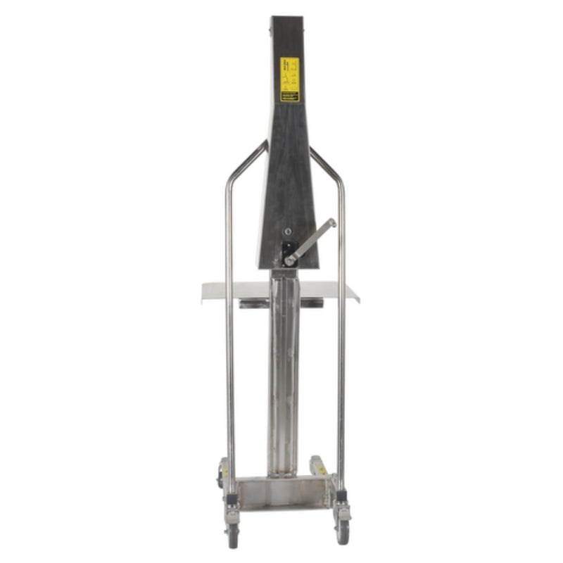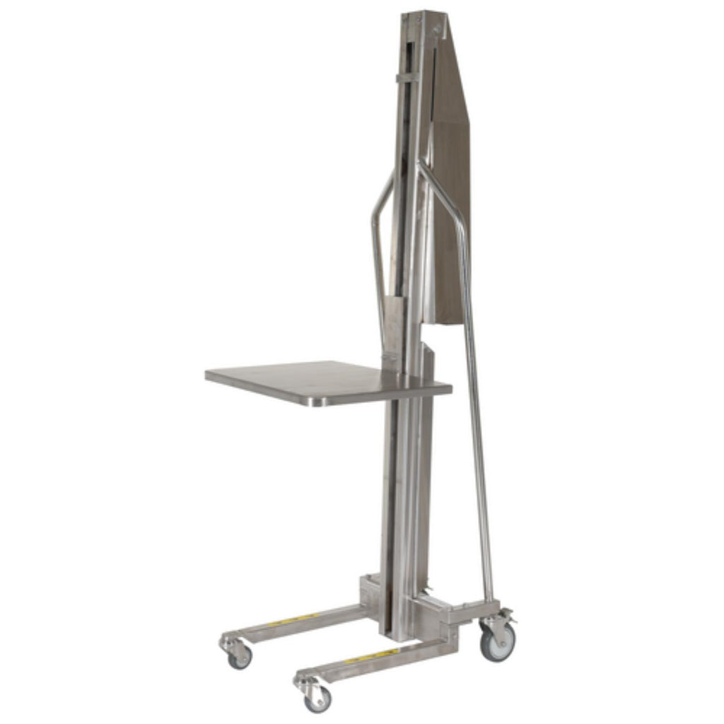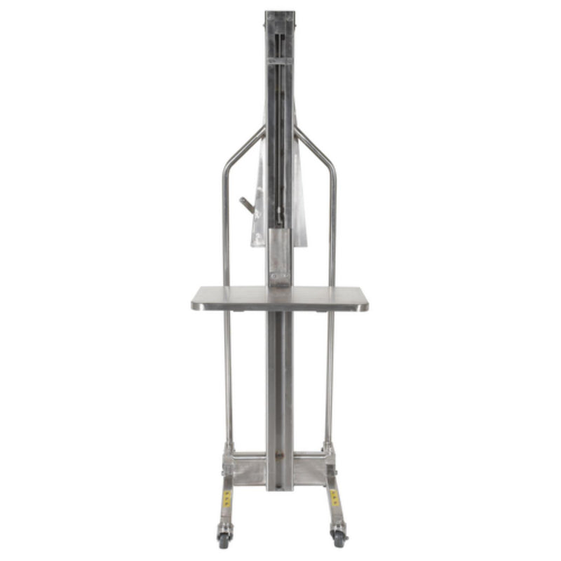 These lightweight lifts are designed to take the strain out of any lifting job. Ideal for use in narrow aisles and confined spaces. Platform height is adjustable with a manual hand winch. An auto brake system allows for controlled lowering. Two (2) 3" swivel load casters and two (2) 5" total locking swivel steering polyurethane casters standard.