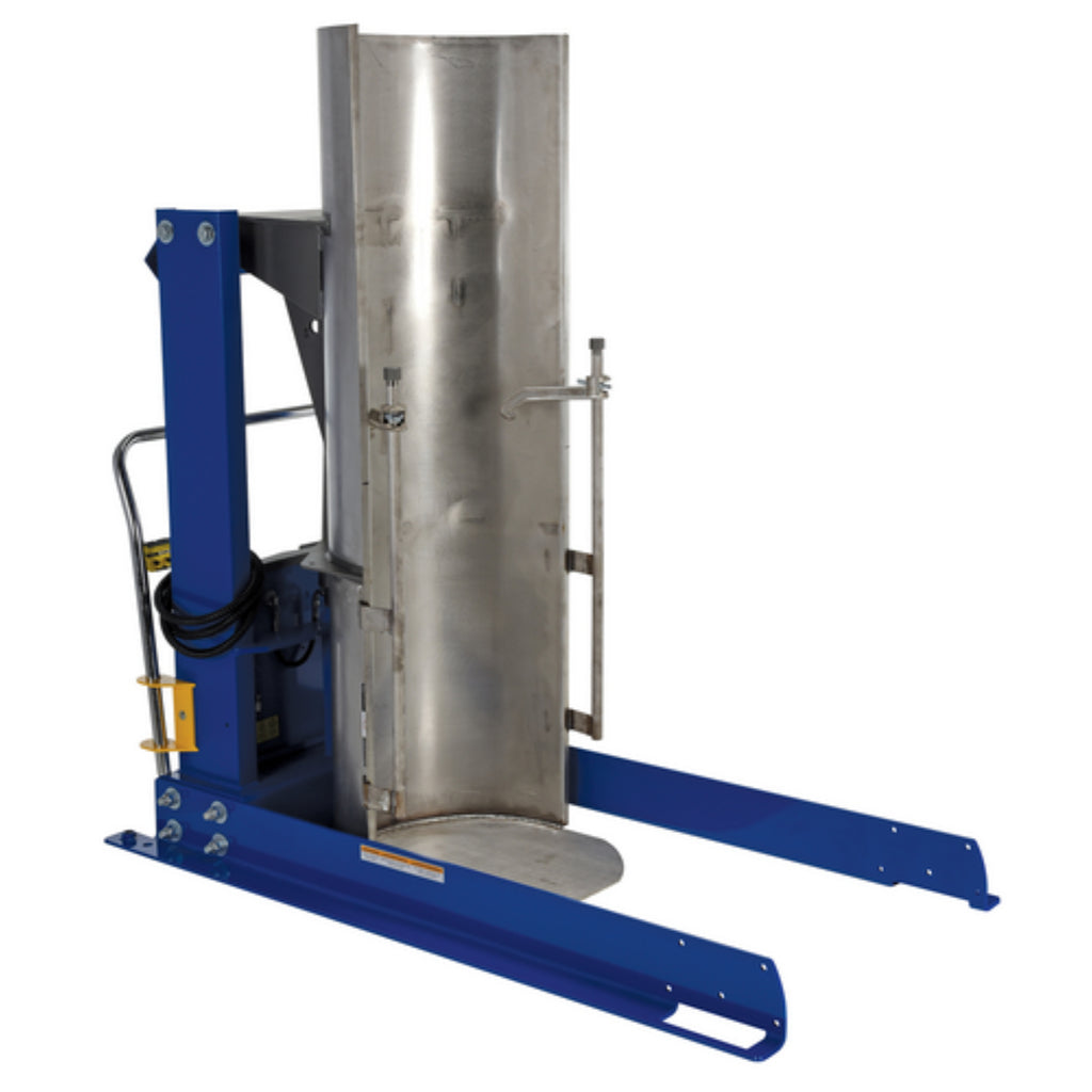 The Hydraulic drum dumper is what you need to dump heavy drums. Works with plastic, steel, and fiber drums. Dumper has a solid steel chute. This portable unit has casters with floor lock screws. All steel construction. Upper travel limit switch, emergency brass safety velocity fuse in cylinder, and vertical adjustment drum restraints are standard. Dumper is operated with a hand held control on a coil cord standard.