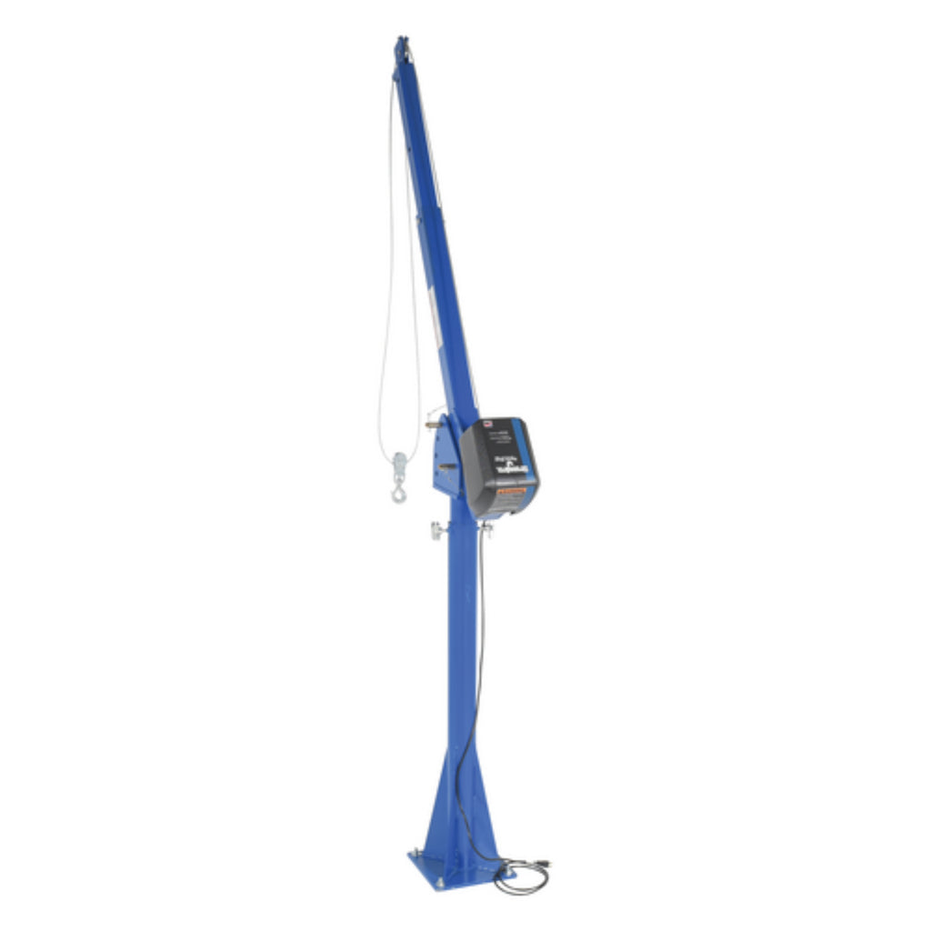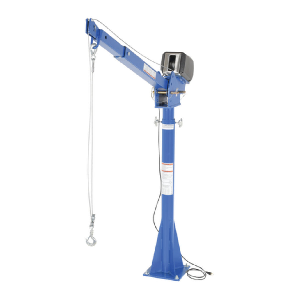 A power lift Jib crane is designed for material handling applications on docks, in warehouses or in truck beds. This intermittent unit uses crane feature rotation hand brakes that offer unlimited positioning. The mast mounts permanently. Boom adjusts in one (1) foot increments and can be positioned at four (4) elevations. Fingertip switch to raise and lower hook. Folds for storage. Unit is designed for vertical lifting only. Do not use unit for lifting personnel or overhead lifting.