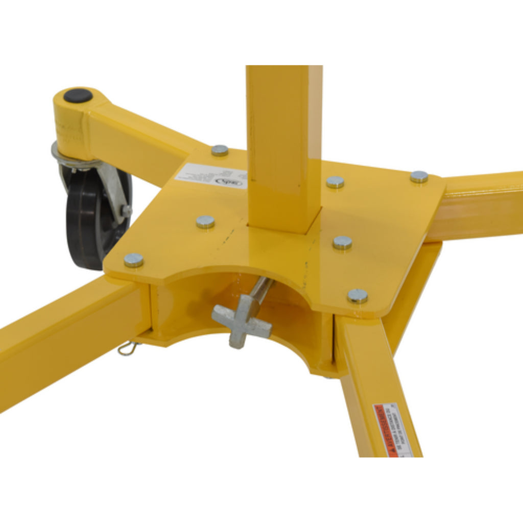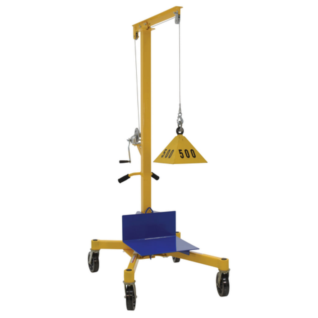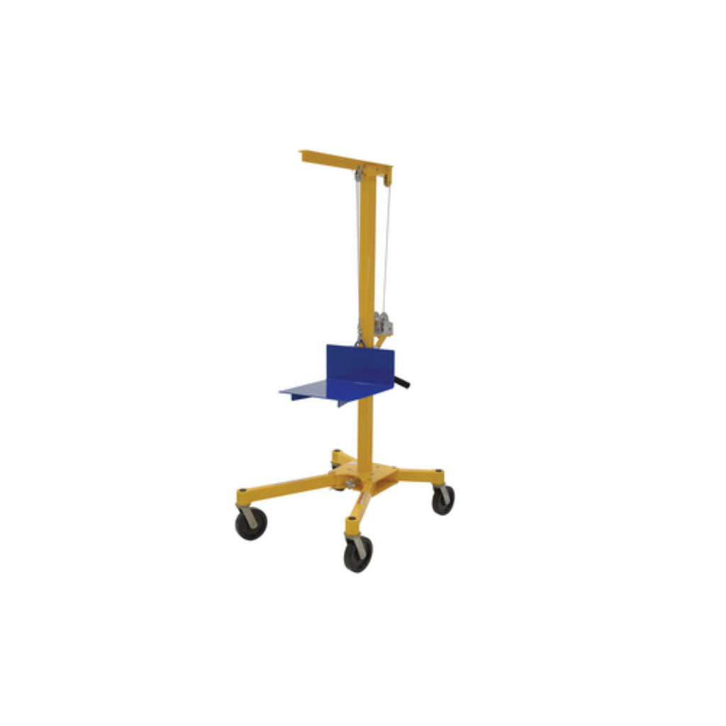 The portable work site lift is ideal for positioning loads where they are needed. It includes a lifting platform and an overhead lifting boom for unique applications. It features a manual hand crank cable winch with hook. Portability is easy with the phenolic swivel casters and a push handle. The unit knocks down in four pieces- base, platform, upright, and boom. It's ideal for storage in tight places and for transportation in the back of a vehicle.