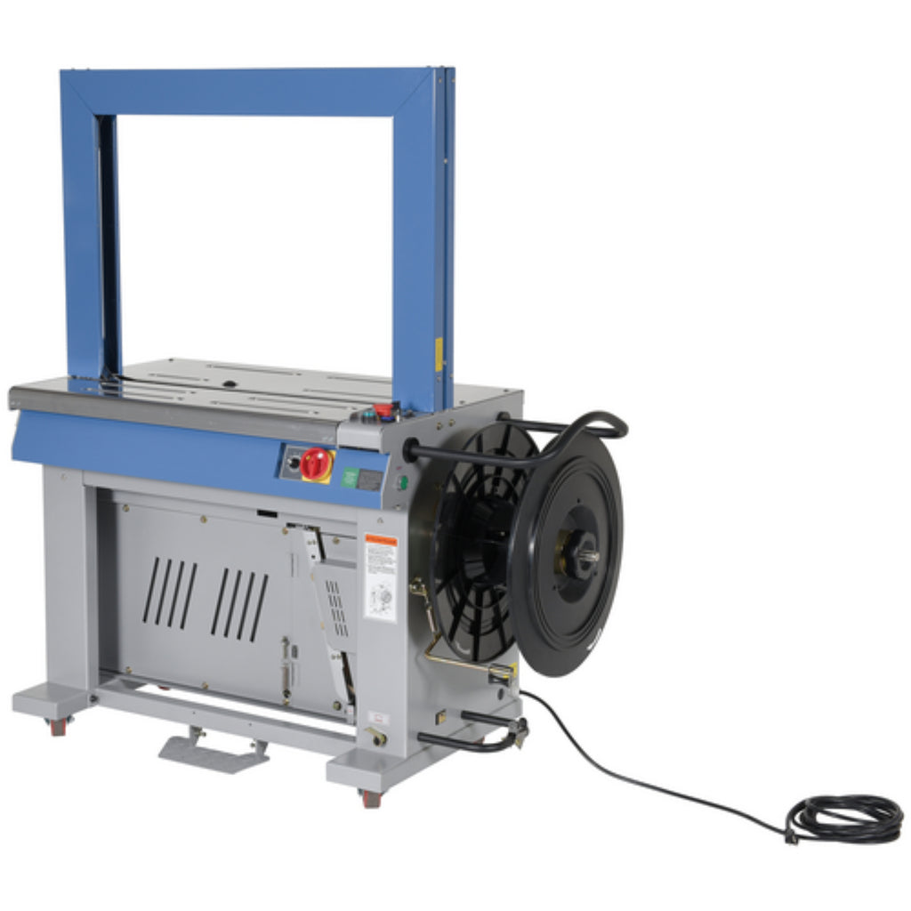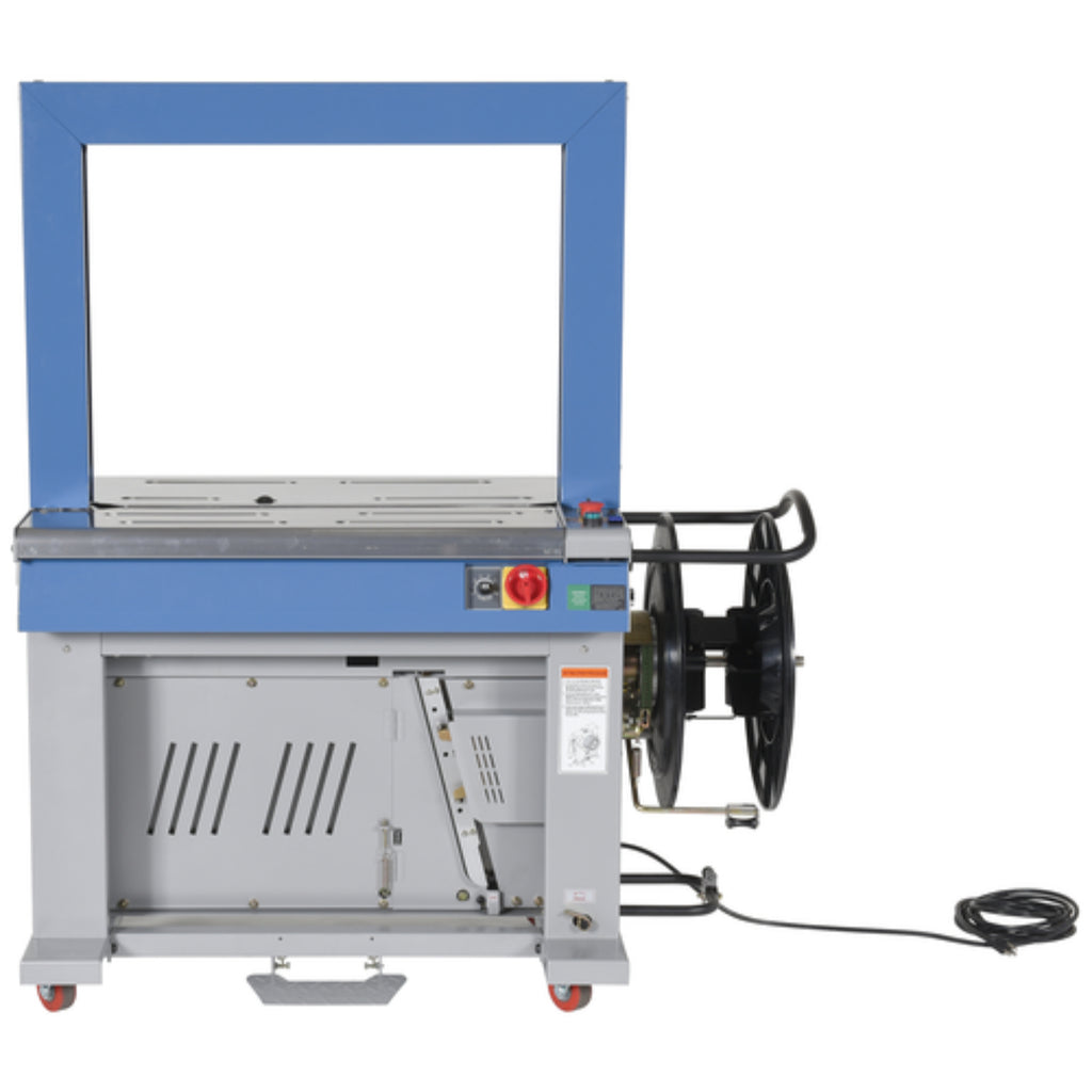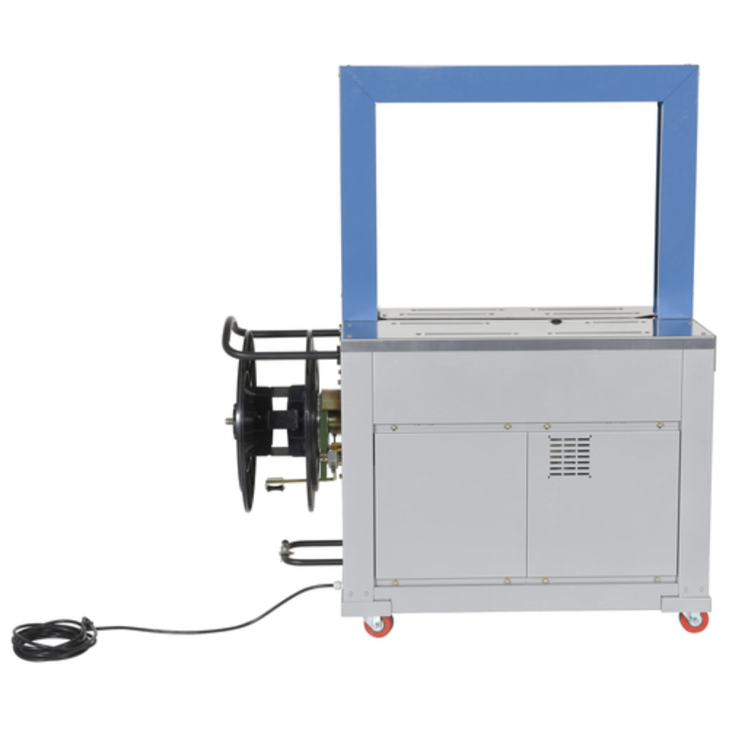 The high speed strapping machine is a productive solution to most polypropylene strapping tasks. The automatic arch strapping machine features the "auto-feeding" function that automatically feeds polypropylene strapping to arch and is ready for each application. The "auto-positioning" system automatically positions and secures the polypropylene strapping efficiently for each cycle. The "jam-free" feature ejects missed strap cycles and resets the unit. The user friendly controls allow the operator to choose between panel mounted controls, foot pedal, or table top ball switch. Actual production will vary depending on package size, chute size, and operator dexterity. The unit has heat welded polypropylene strapping, easy access for reloading strapping and portability for convenience. (Polypropylene strapping is sold separately).