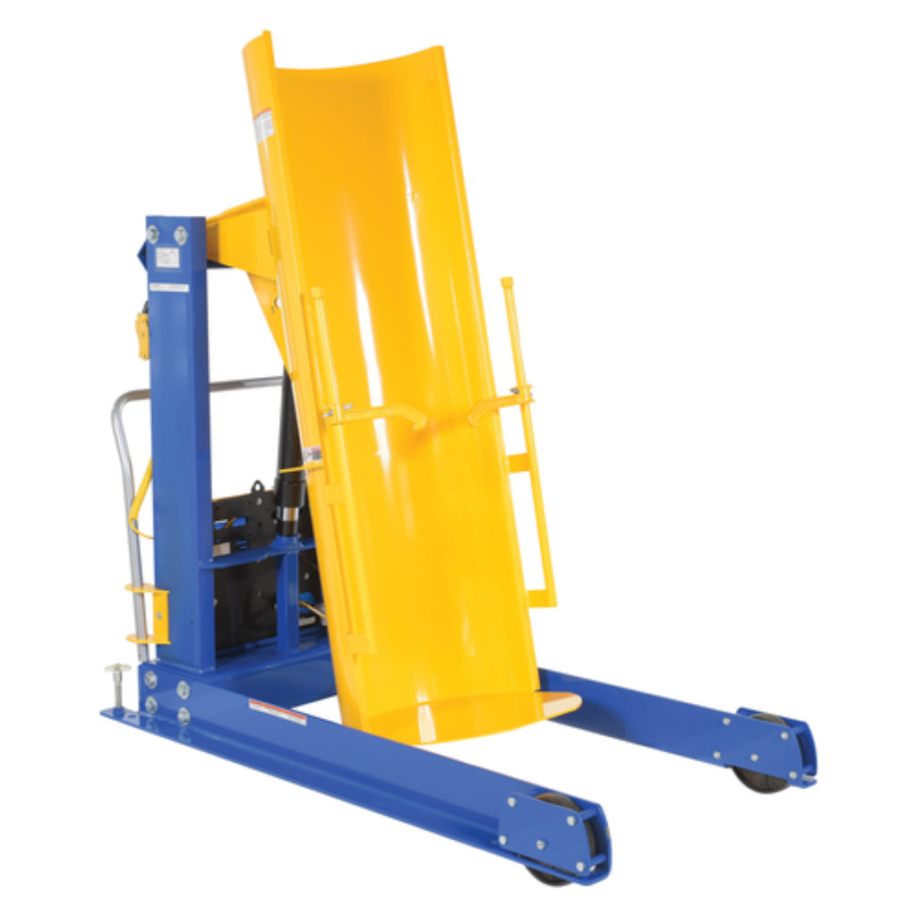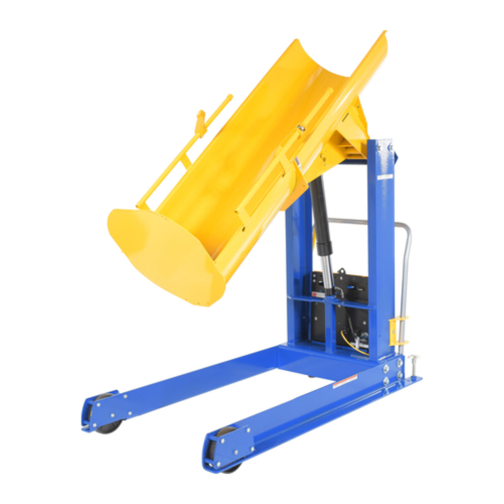 The Hydraulic drum dumper is what you need to dump heavy drums. Works with plastic, steel, and fiber drums. Dumper has a solid steel chute. this portable unit has casters with floor lock screws. Upper travel limit switch, emergency brass safety velocity fuse in cylinder are standard. All steel construction.