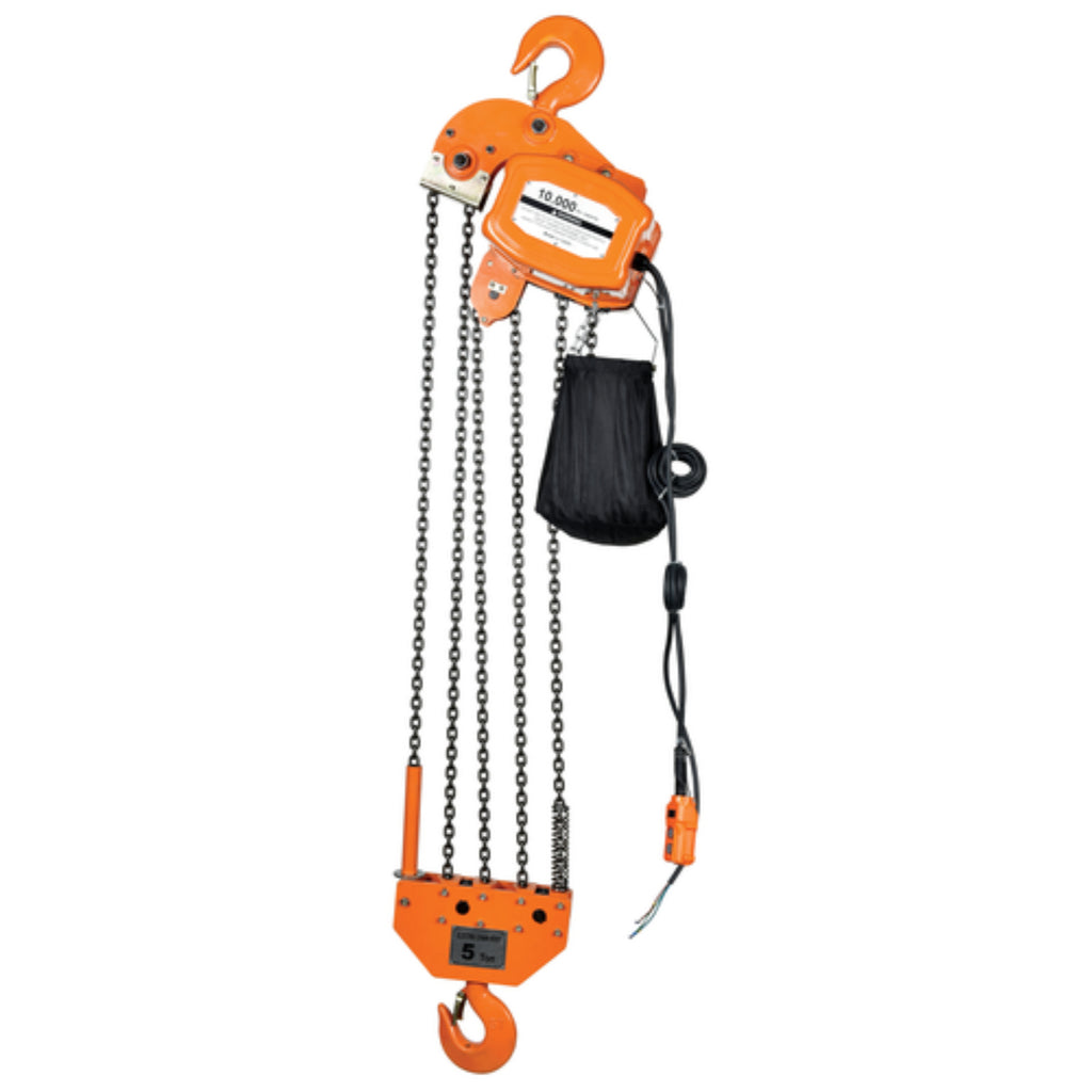This compact hoist features a high efficiency motor with convenient push-button operation. Single phase power available. Unit is dust and water resistant, load limit fitted. Chain container included.