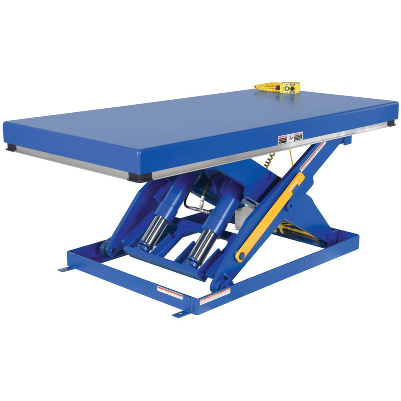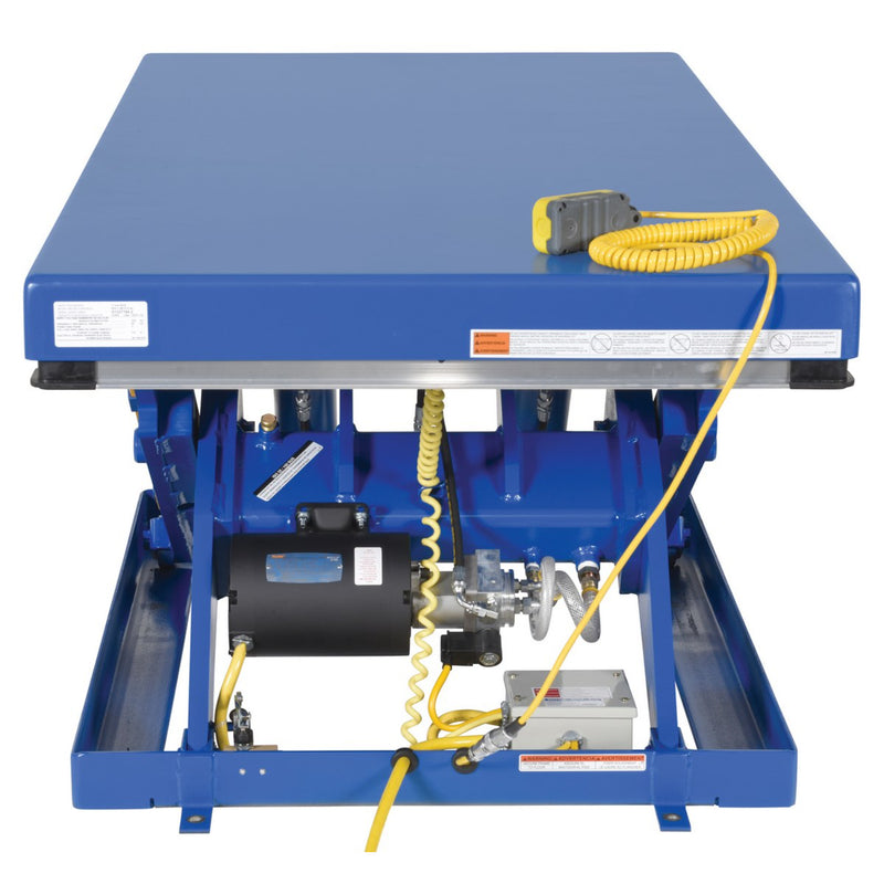 The electric hydraulic scissor lift table is used by all types of manufacturing and warehouse facilities. Safety features include a patented pinch point perimeter toe guard to protect pinch points while lowering the table, fused push button control, internal safety velocity fuse to maintain platform height in the event of hose or fitting failure, integral maintenance prop, adjustable upper travel limit switch to stop the table at maximum height, and displacement-style hydraulic cylinders for maximum strength. It also features a pressure plated pump, manifold system, and state-of-the-art lifetime lubricated bearings. The standard 56 frame electric motor is fully enclosed with additional voltage options available. Contact factory if platform dimensions are crucial.