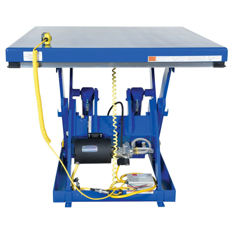 The electric hydraulic scissor lift table is used by all types of manufacturing and warehouse facilities. Safety features include a patented pinch point perimeter toe guard to protect pinch points while lowering the table, fused push button control, internal safety velocity fuse to maintain platform height in the event of hose or fitting failure, integral maintenance prop, adjustable upper travel limit switch to stop the table at maximum height, and displacement-style hydraulic cylinders for maximum strength. It also features a pressure plated pump, manifold system, and state-of-the-art lifetime lubricated bearings. The standard 56 frame electric motor is fully enclosed with additional voltage options available. Contact factory if platform dimensions are crucial.