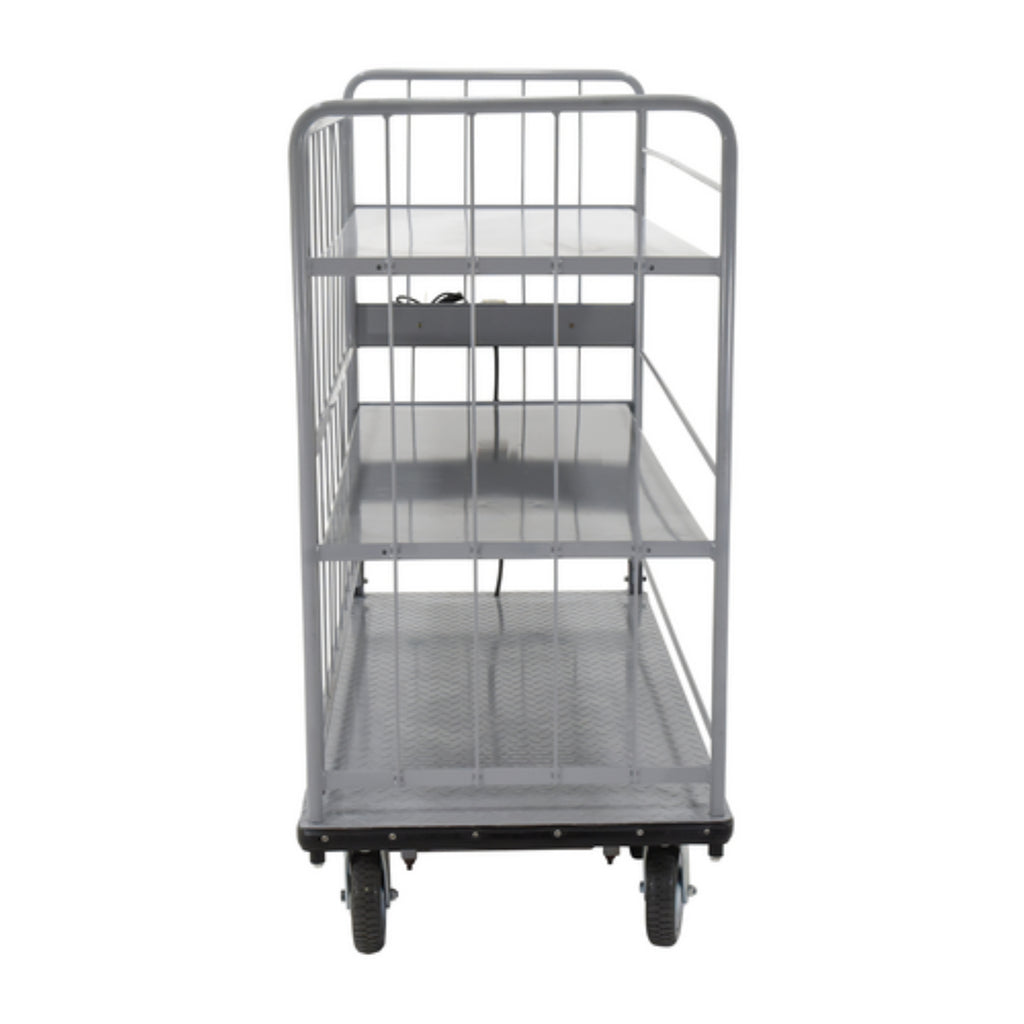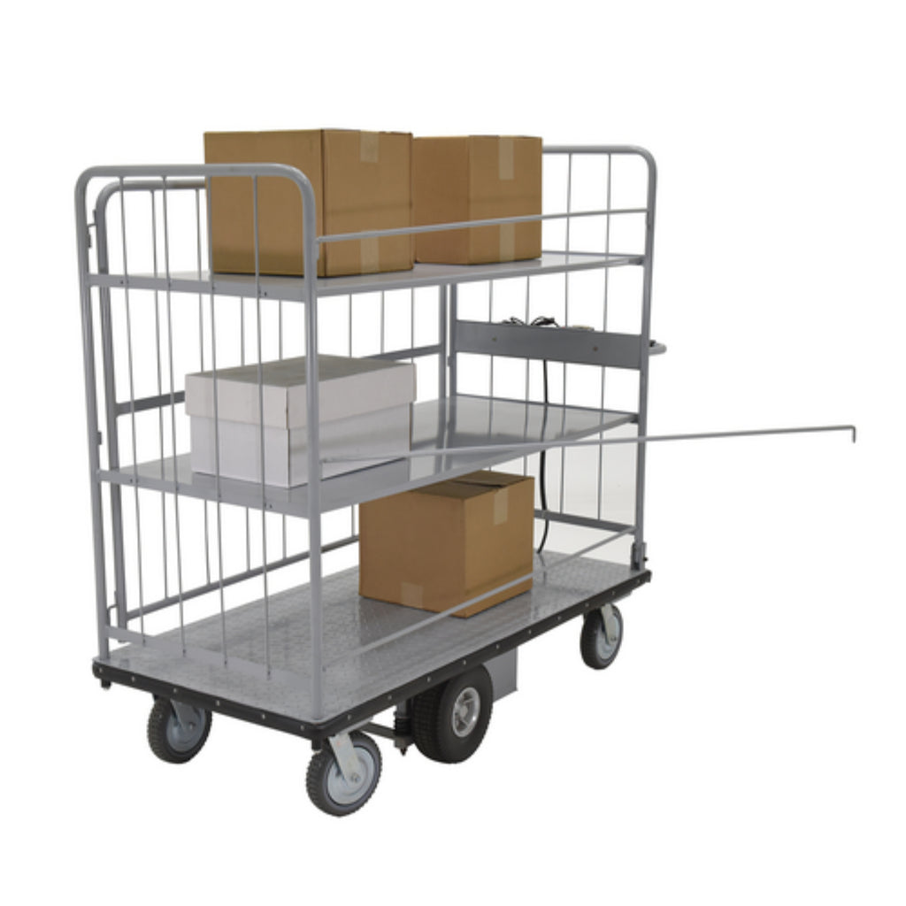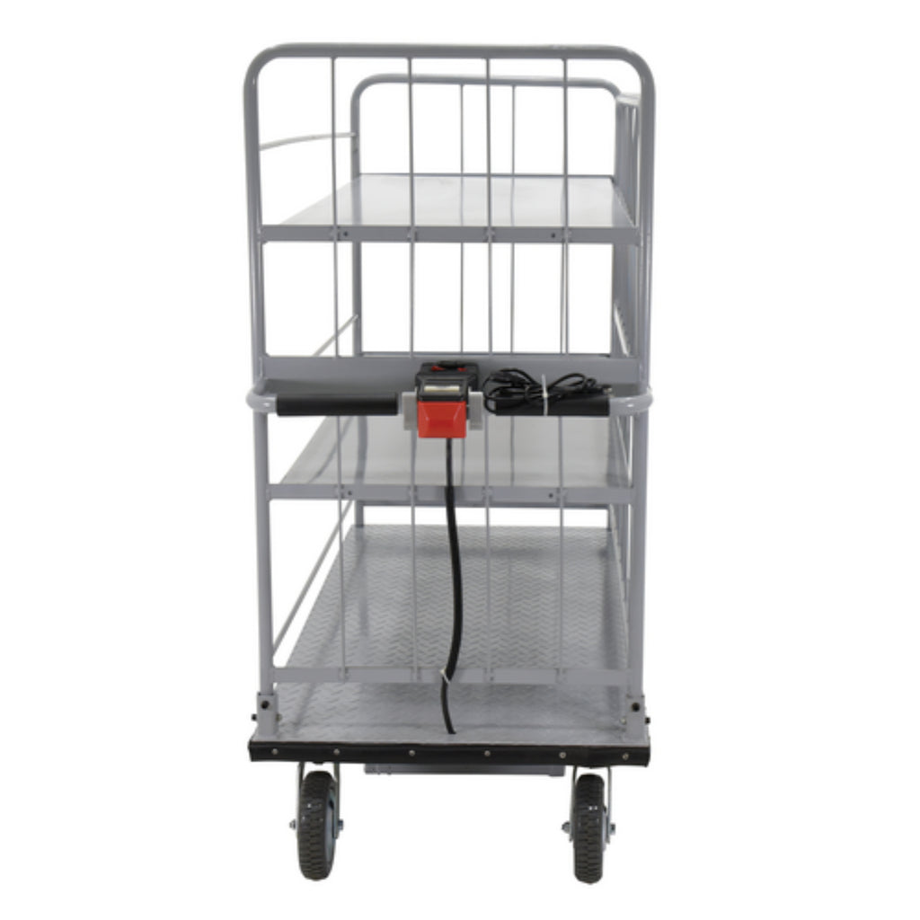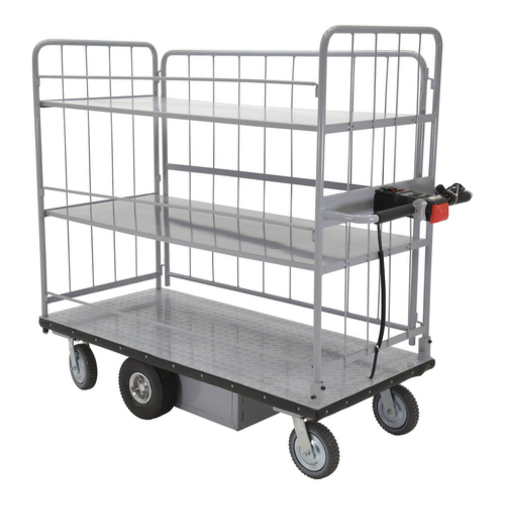 Electric material handling carts are ideal for moving heavy loads safely and easily throughout warehouses, offices, schools, and hospitals and incorporates a multitude of features to make light work of heavy loads. Reduce injury and increase productivity with these high quality carts. Features an 800W electric drive motor with (2) two 12V batteries for power and on-board 115V AC battery charger. The handle includes forward and reverse throttle control levers, an emergency reverse switch, a battery level gauge, and a slow/fast speed switch. Pinpoint turning is accurate with the mid-axle drive feature.