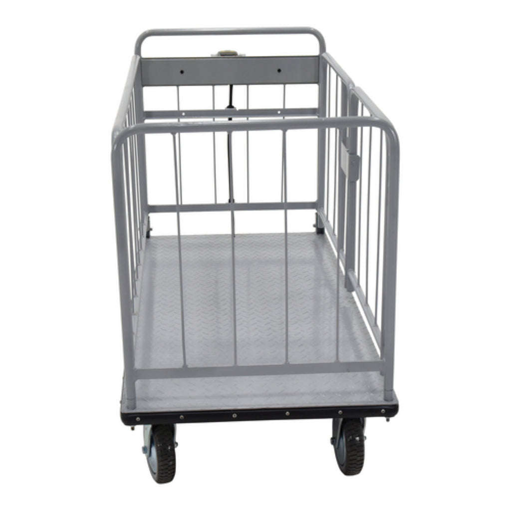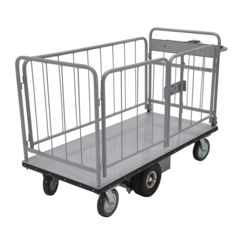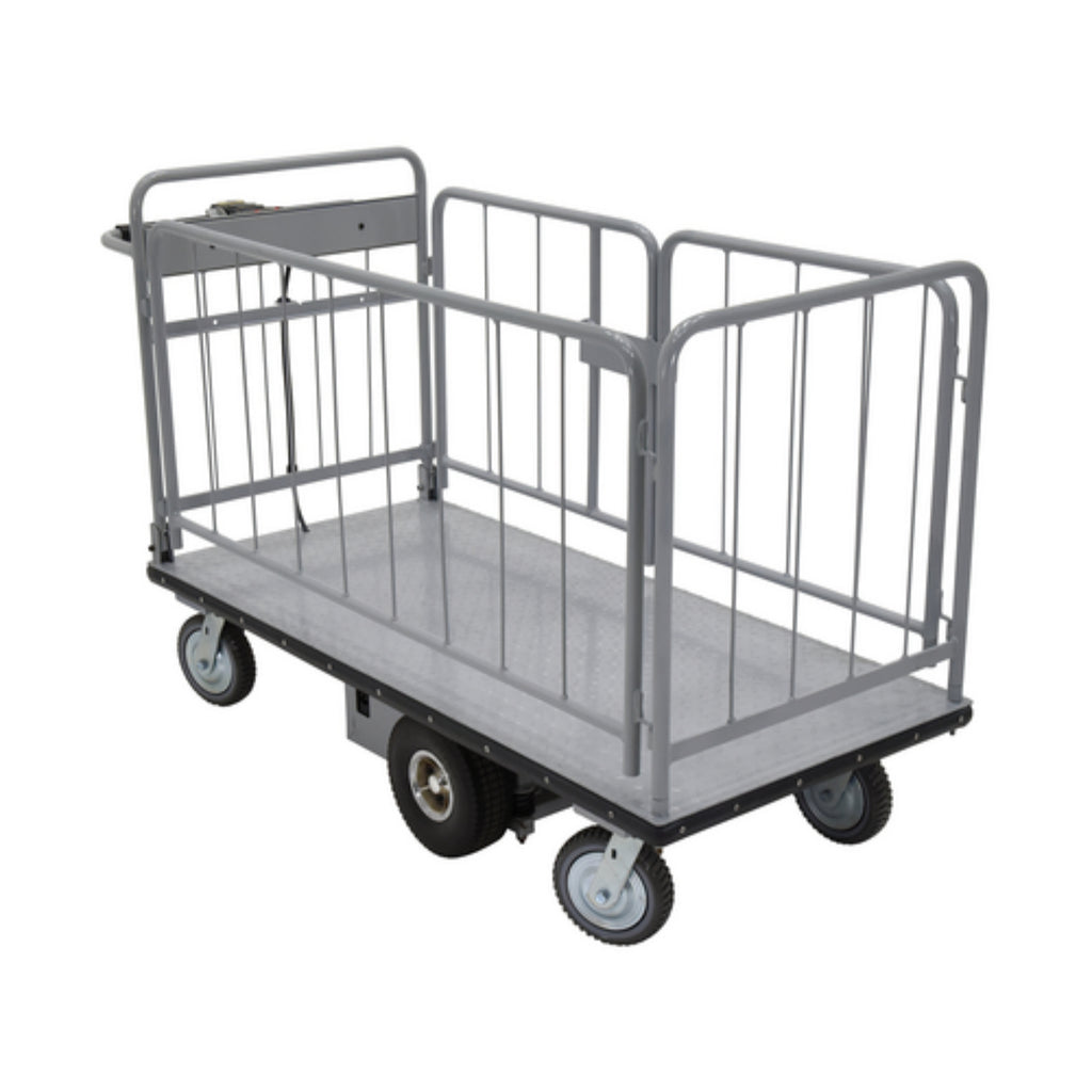 Electric material handling carts are ideal for moving heavy loads safely and easily throughout warehouses, offices, schools, and hospitals and incorporates a multitude of features to make light work of heavy loads. Reduce injury and increase productivity with these high quality carts. Features an 800W electric drive motor with (2) two 12V batteries for power and on-board 115V AC battery charger. The handle includes forward and reverse throttle control levers, an emergency reverse switch, a battery level gauge, and a slow/fast speed switch. Pinpoint turning is accurate with the mid-axle drive feature.