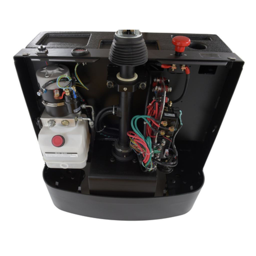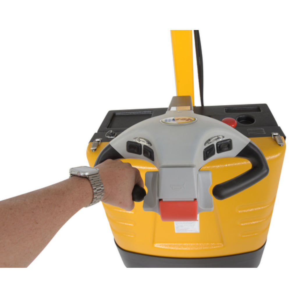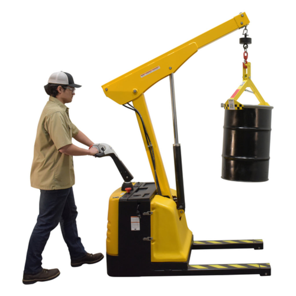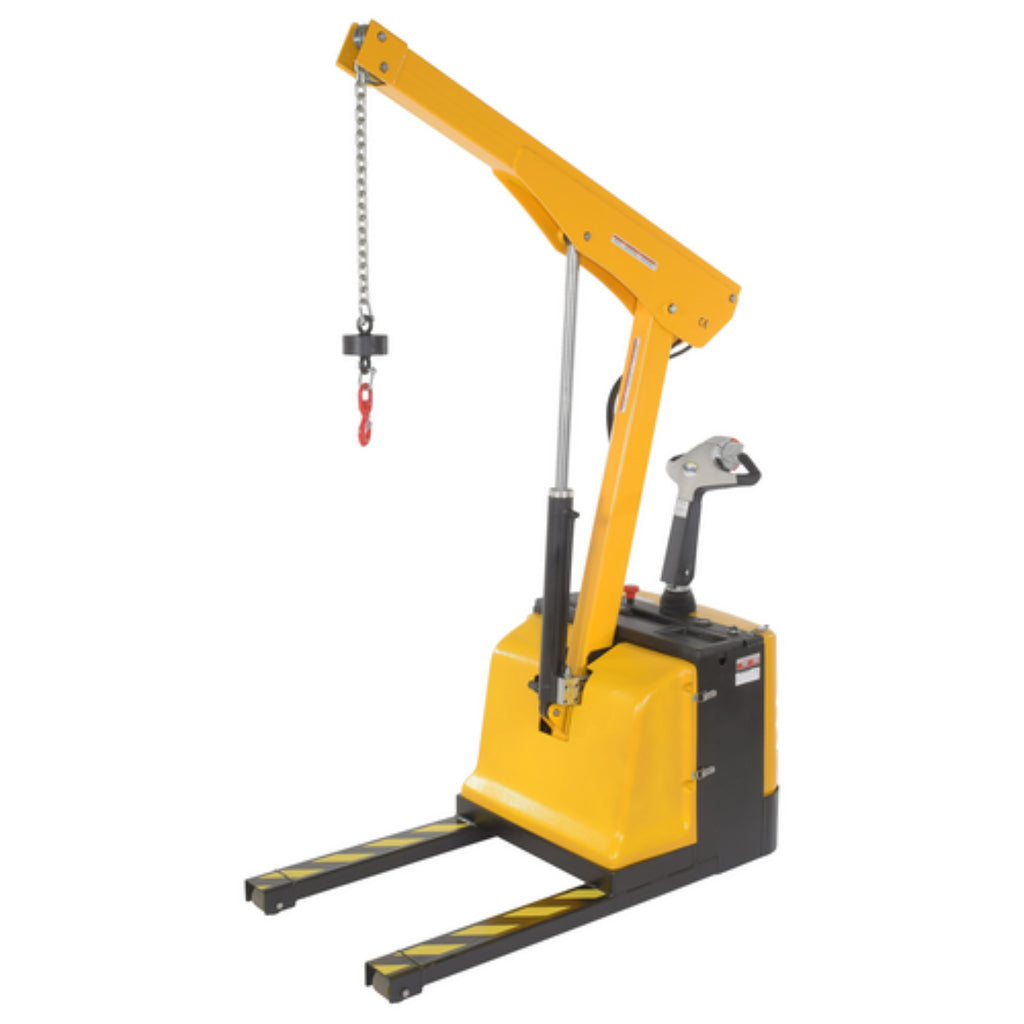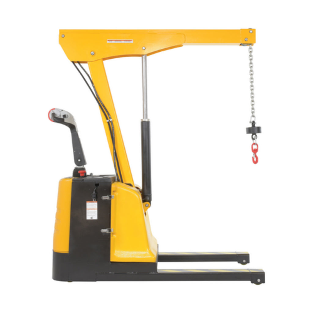 The low profile electric powered floor crane is a safe and efficient way to lift and move equipment. With the push of a button, the unit raises and lowers loads. Its low profile design can be maneuvered in narrow and crowded warehouses. An included rigid hook with safety latch provides security during lifting. Poly-on-steel, steer and load wheels provide a smooth roll. The handle is both ergonomic and functional, featuring a throttle with infinite forward and reverse speed adjustments. Emergency reverse belly switch instantly reverses direction. Horn is also included.