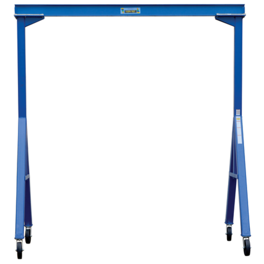 The fixed height steel gantry crane is designed for transporting and positioning materials along the beams length. The solid steel construction will provide years of service, while the painted blue finish will keep the models protected from surface ware. The rigging locks in 1 of 4 positions; you can set the wheels and push the gantry crane forward, back, left or right. The unit is an economical and efficient way to lift and raise products, diminishing the need of additional personnel. The fixed height design allows for constant use in a particular setting without the need to maneuver the overall height of the unit.